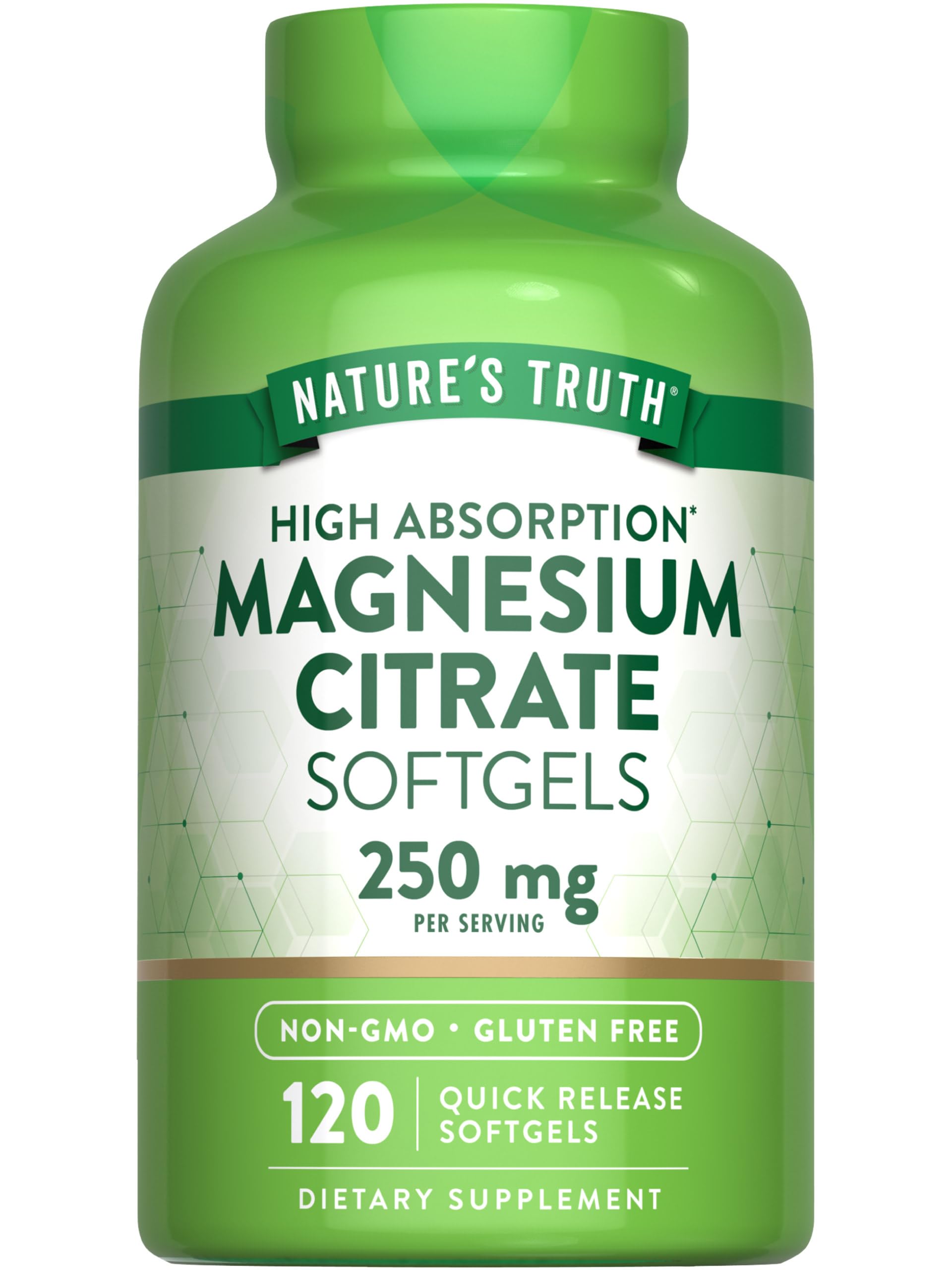 FREE OF: Gluten, Wheat, Yeast, Milk, Lactose, Soy, Artificial Sweetener Flavor, Preservatives and Non-GMO. EXPERTS YOU CAN TRUST: Backed by three generations of Vitamin Innovators for unrivaled quality. HONEST TRANSPARENT: Nature's Truth is committed to delivering the best quality wellness products. HIGH ABSORPTION FORMULA: Each serving delivers 250 mg of Magnesium as Magnesium Citrate per serving . ESSENTIAL MINERAL: Receive daily essential mineral support with Magnesium Citrate Softgels.