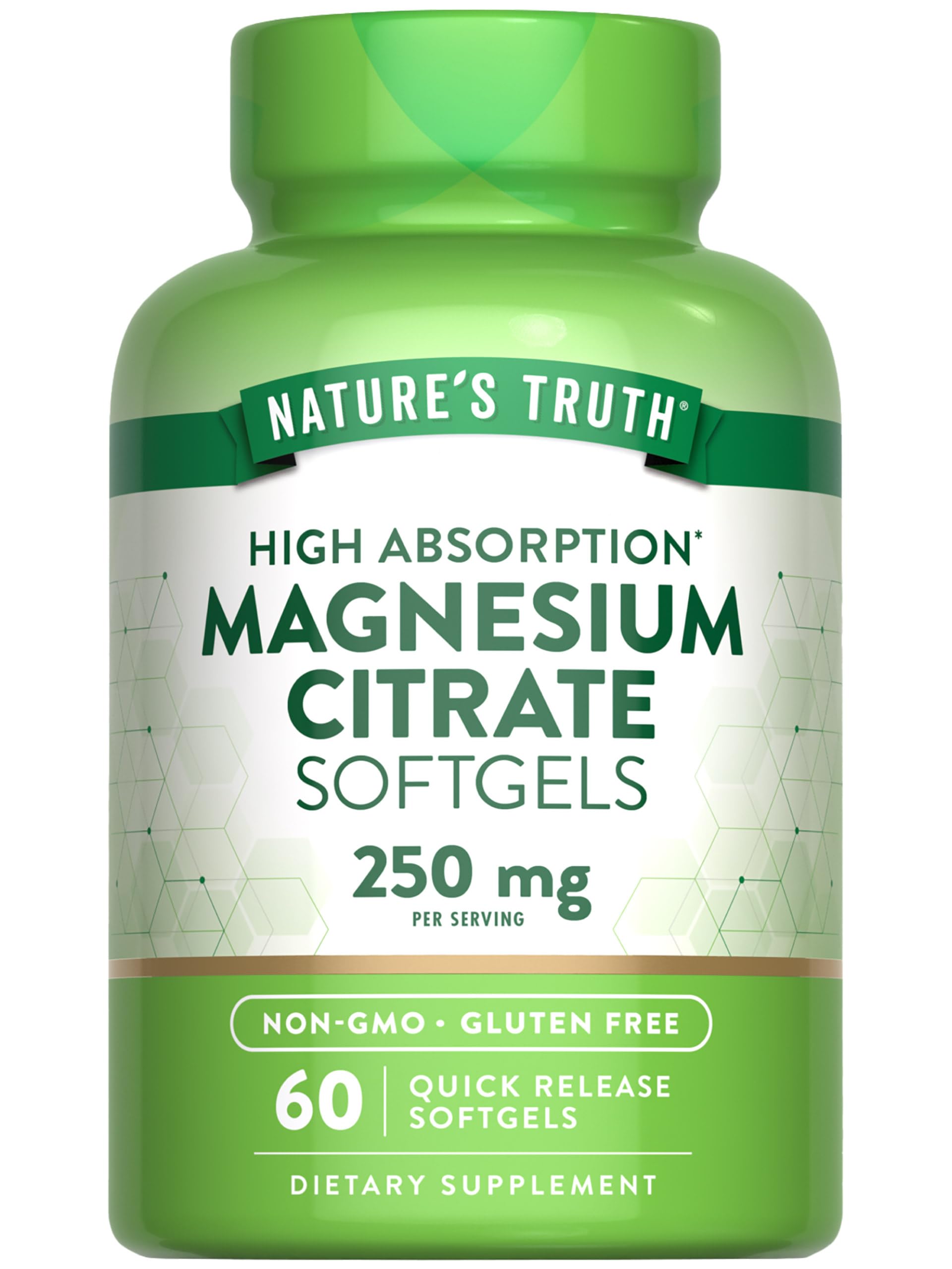 NATURALLY FREE OF: Gluten, Wheat, Yeast, Milk, Lactose, Soy, Artificial Flavor Sweetener, Preservatives, and Non-GMO. EXPERTS YOU CAN TRUST: Backed by three generations of Vitamin Innovators for unrivaled quality. HONEST TRANSPARENT: Nature's Truth is committed to delivering the best quality wellness products. HIGH ABSORPTION FORMULA: Receive 250 mg of Magnesium as Magnesium Citrate . ESSENTIAL MINERAL: Receive daily essential mineral support with Magnesium Citrate softgels.