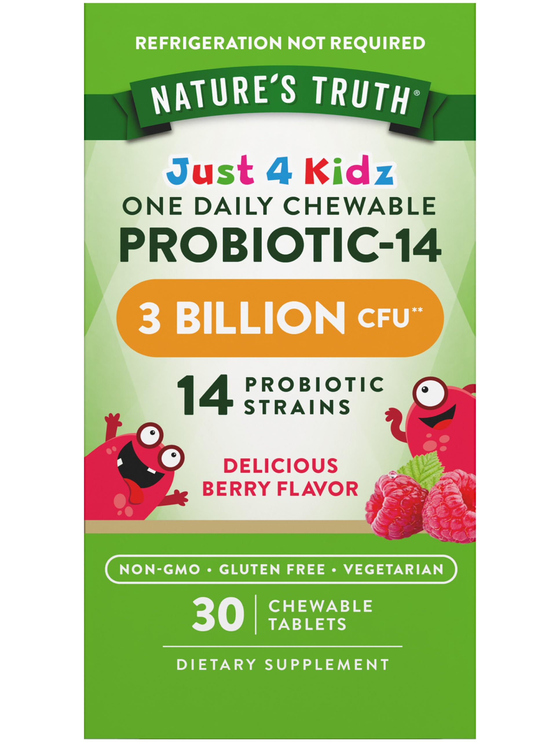 MADE WITHOUT: Gluten, Wheat, Soy Artificial Color, and Non-GMO. EXPERTS YOU CAN TRUST: Backed by three generations of Vitamin Innovators for unrivaled quality. HONEST TRANSPARENT: Nature's Truth is committed to delivering the best quality wellness products. CHEWABLE TABLETS: One vegetarian chewable tablet each day in a delicious berry flavor. PROBIOTIC FOR KIDS: Tummy friendly probiotic formulated just for kids with 14 probiotic strains.