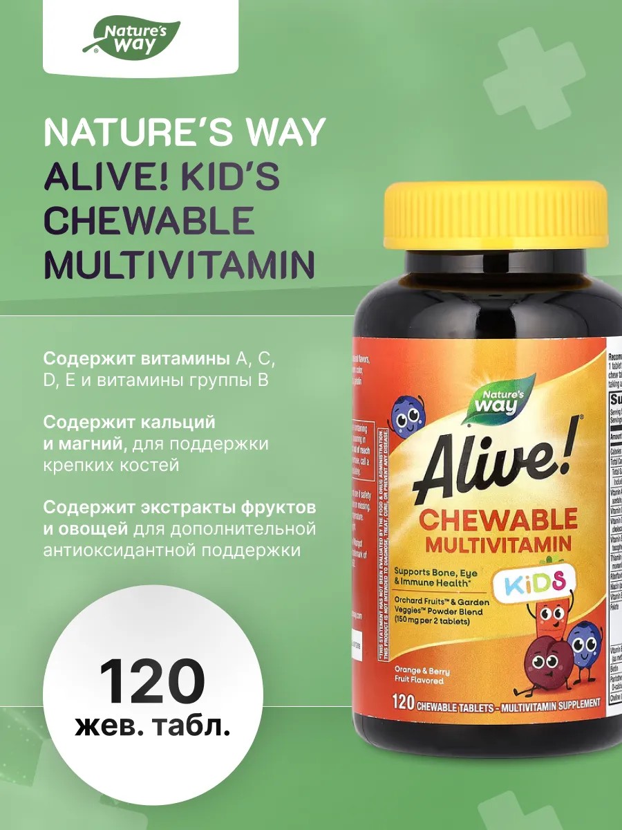 Nature's Way Alive! Kid's Chewable Multivitamin — это жевательные мультивитамины для детей, которые содержат разнообразные витамины и минералы, необходимые для поддержания здоровья и роста. Эти витамины имеют вкус апельсина и ягод, что делает их приятными для детей.