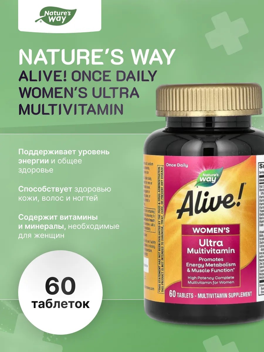 Nature's Way Alive! Once Daily Women's Ultra Multivitamin представляет собой высококачественный комплекс витаминов и минералов, специально разработанный для женщин. Эта добавка содержит широкий спектр необходимых питательных веществ, включая витамины A, C, D, E, витамины группы B, а также минералы, такие как кальций и магний, которые поддерживают общее здоровье, уровень энергии и здоровье кожи.Эта добавка идеально подходит для женщин, стремящихся обеспечить организм всеми необходимыми витаминами и минералами в одной таблетке, а также для тех, кто хочет поддерживать здоровье волос, ногтей и иммунной системы.