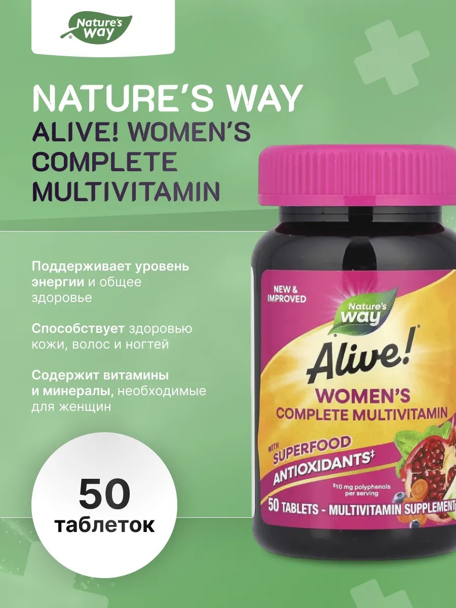 Nature's Way Alive! Women's Complete Multivitamin представляет собой высококачественный комплекс витаминов и минералов, специально разработанный для женщин. Эта добавка содержит широкий спектр необходимых питательных веществ, включая витамины A, C, D, E, а также витамины группы B и минералы, такие как кальций и магний, которые поддерживают общее здоровье и благополучие.Эта добавка идеально подходит для женщин, стремящихся поддерживать уровень энергии, здоровье кожи, волос и ногтей, а также для тех, кто хочет обеспечить организм всеми необходимыми витаминами и минералами.