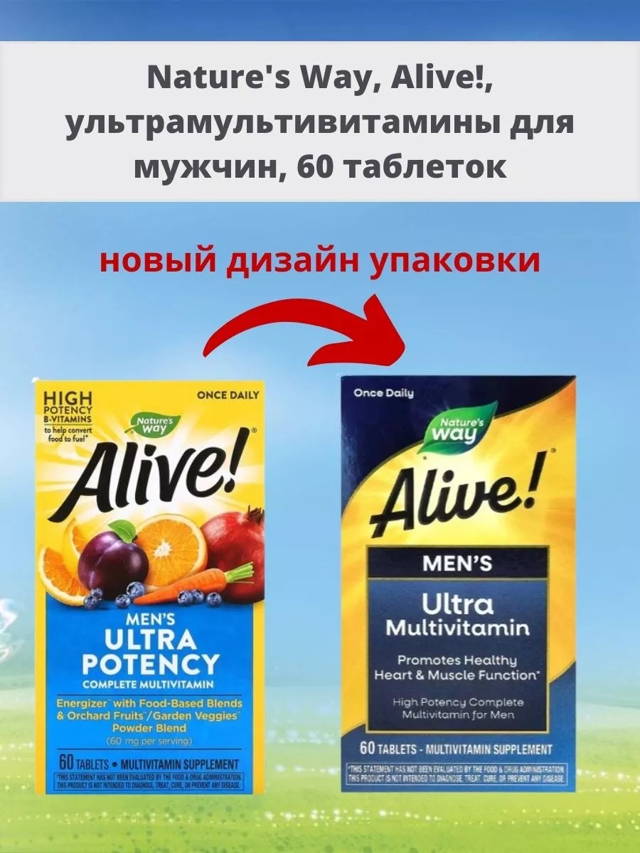 Созданная специально для мужчин, эта добавка содержит высокоэффективные витамины группы B, включая активную форму витамина B12 и фолат.Для здоровья глаз: бета-каротин (витамин A), витамин C, витамин E, лютеин, цинкДля здоровья костей: кальций, фолат, магний, марганец, витамин D3, витамин KДля здоровья сердца: витамины группы B, витамин С, витамин EДля здоровой иммунной системы: селен, цинк, витамин A, витамин C, витамин D3Для энергетического обмена: витамины группы BДля поддержки мускулов: магний, витамин B6 и витамин D3Мультивитамины Alive! дарят вам заряд энергии, чтобы вы могли заниматься тем, что вам нравится! Получите максимум пользы от мультивитаминов, в состав которых входят эффективные витамины, микроэлементы и пищевые смеси. Ощущайте радость от каждого дня, будьте бодрыми (Alive)!Рекомендации по применениюМужчинам принимать по 1 таблетке в день, желательно во время еды. Не предназначено для женщин и детей. Не следует превышать рекомендуемую дозировку.ИнгредиентыЦеллюлоза, стеариновая кислота, кроскармеллоза натрия, диоксид кремния, гипромеллоза, стеарат магния, глицерин, коричневый рис.Без глютена и искусственных красителей.ПредупрежденияНе принимайте во время беременности или кормления грудью. Если у вас есть нарушения свертываемости крови, вы принимаете или любые другие лекарства, перед применением проконсультируйтесь с врачом.Хранить в недоступном для детей месте. В целях безопасности имеет внутреннюю защитную пленку с принтом. Не используйте данный продукт, если защитная мембрана повреждена или отсутствует. Хранить при комнатной температуре. Бутылку следует хранить с плотно закрытой крышкой.