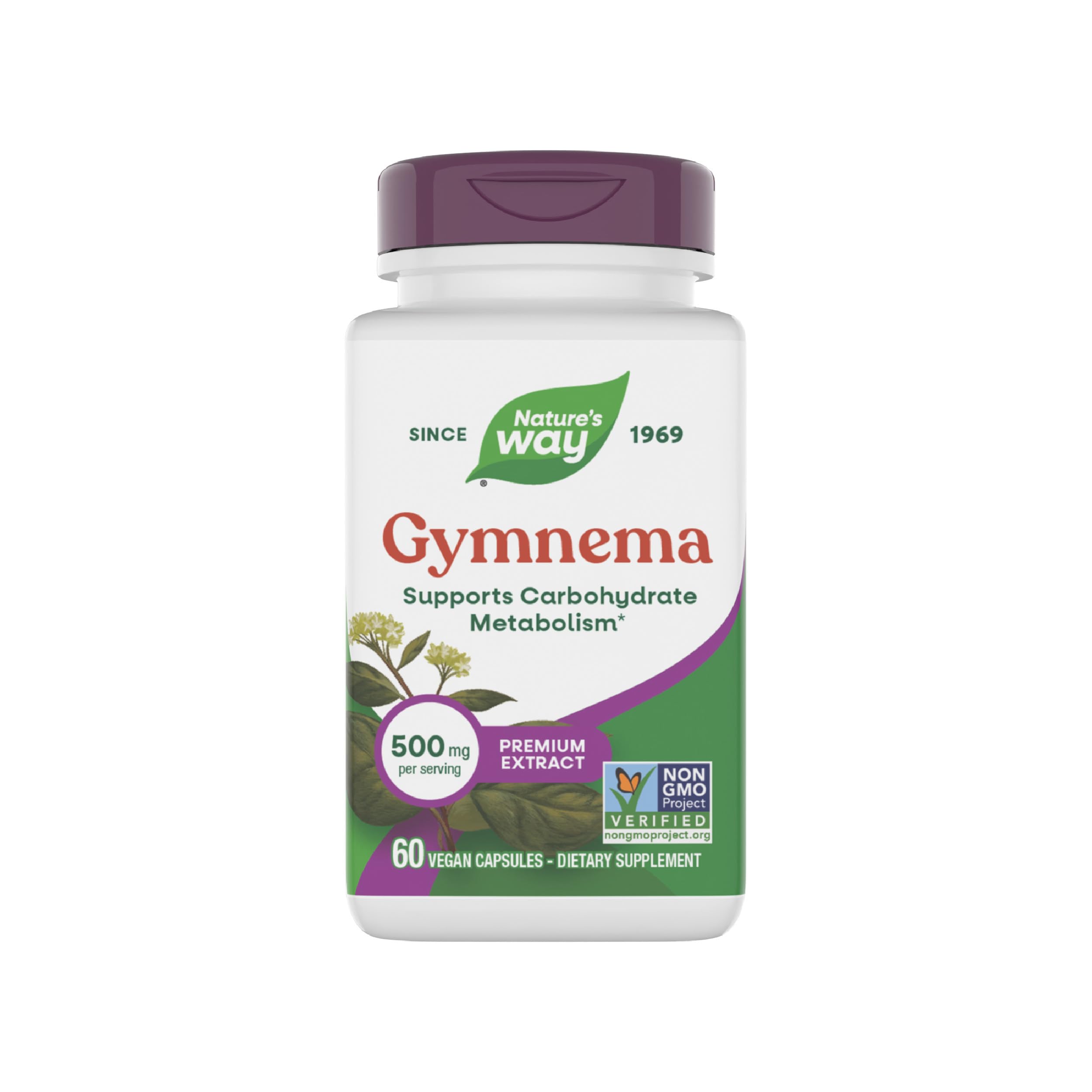 At Nature's Way, we believe nature is the ultimate problem solver. For over 50 years, we have looked to the natural world for inspiration. Our quality vitamins and supplements are formulated to help you find your way to wellness. Gluten free and vegan. No salt, wheat, soy, dairy, gelatin, or artificial colors or flavors. Non-GMO Project Verified. Adults take 1 capsule three times daily, preferably with food. With 500 mg of gymnema leaf extract per serving. Nature's Way Gymnema Premium Extract supports healthy carbohydrate metabolism. .