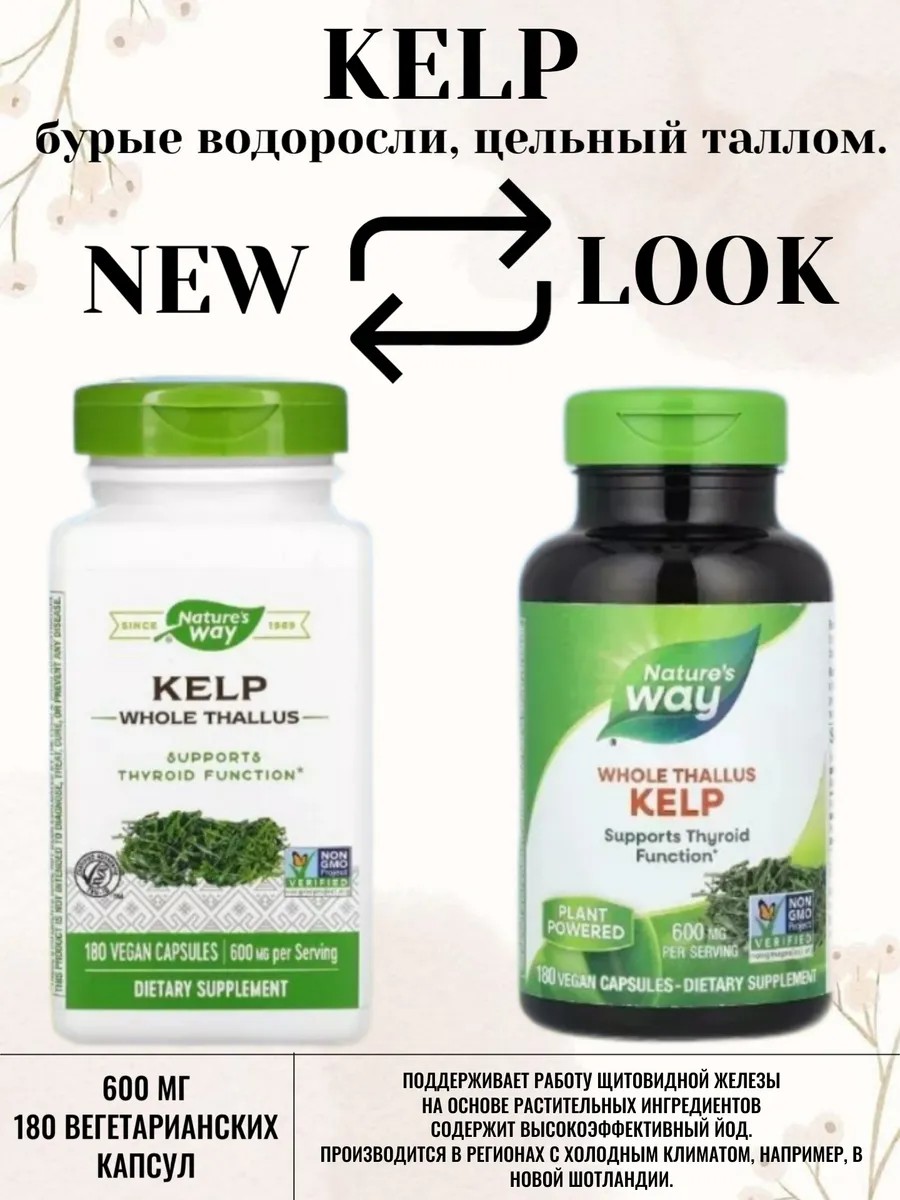 Бурые водоросли растут под водой и являются отличным источником йода. Nature’s Way использует водоросли, полученные без нанесения вреда окружающей среде из холодных водоемов, таких как в Новой Шотландии, где собиратели диких растений аккуратно срезают листья, не выкорчевывая растения, чтобы дать им возможность отрасти в будущем. Сотрудники Nature’s Way уверены, что только природа способна дать нам все самое лучшее. Именно поэтому мы отбираем самые качественные травы, которые только есть на земле. Таким образом мы обеспечиваем бескомпромиссное качество и помогаем вам вести здоровый образ жизни. Рекомендации по применению: