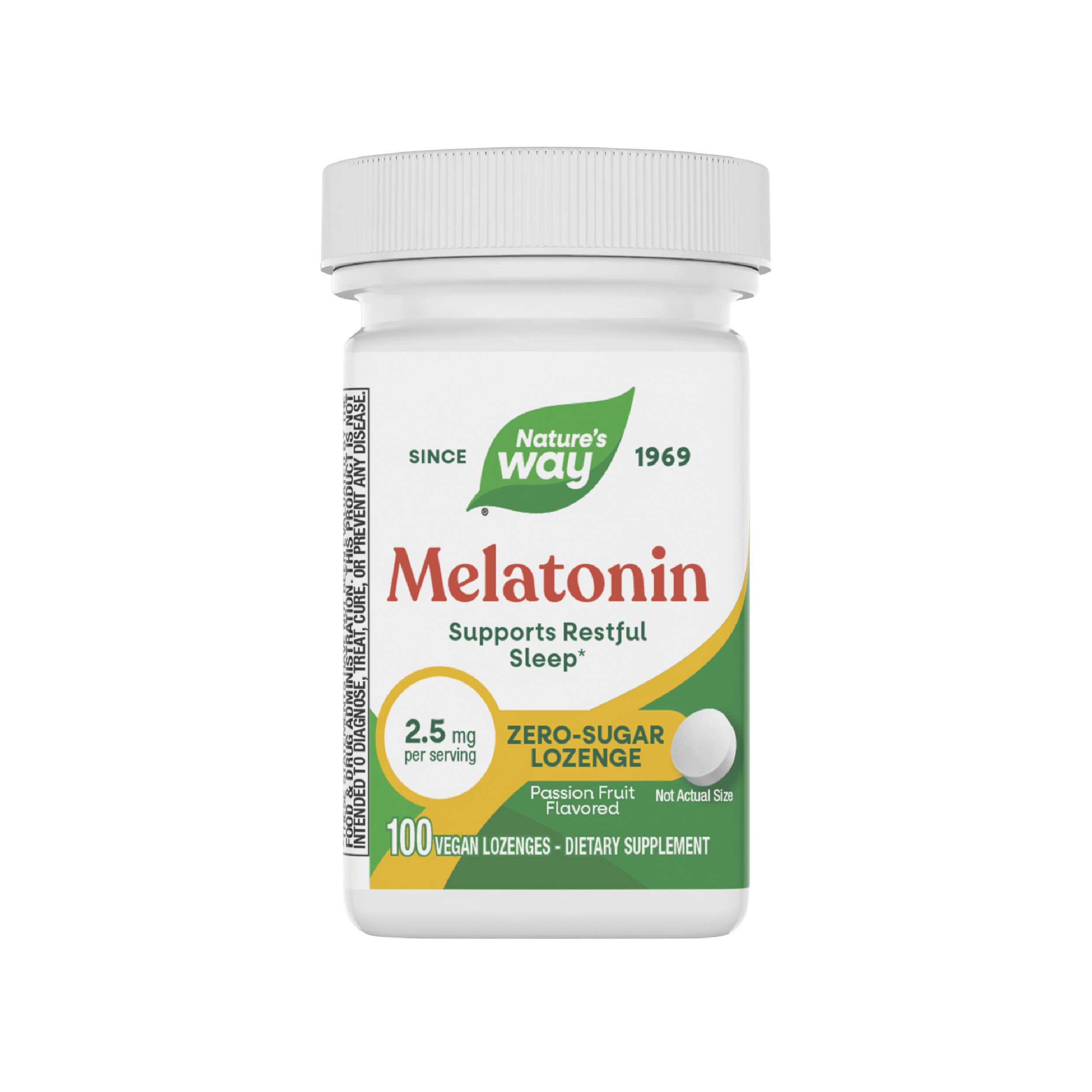At Nature's Way, we believe nature is the ultimate problem solver. For over 50 years, we have looked to the natural world for inspiration. Our quality vitamins and supplements are formulated to help you find your way to wellness. Vegan. No gluten, sugar, wheat, soy, dairy, gelatin, or artificial colors or flavors. Adults take 1 lozenge 30-60 minutes before bedtime. Vegan lozenges provide 2.5 mg melatonin per serving. Passion fruit flavored. Nature's Way Melatonin Lozenges support restful sleep and sleep quality. .