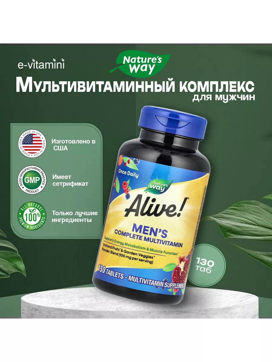 Alive! Мультивитамины для повышения уровня энергии для мужчин — это простой способ получить необходимую энергетическую поддержку. 100% суточной нормы или более 19 витаминов и минералов. Содержит витамины группы B. Не содержит глютена.