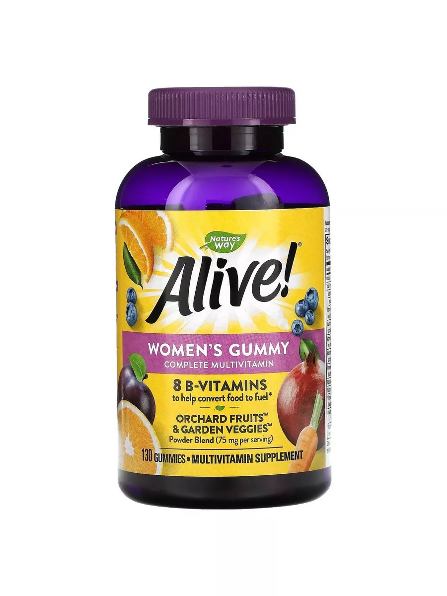 Nature's Way Women's Multivitamin, Alive! Berry Flavor, 130 Gummies: 8 B vitamins to help convert food into energy. Orchard Fruits and Garden Veggies powder blends (75 mg per serving). Multivitamin supplement. 16 vitamins and trace minerals with boron and inositol. A complete B vitamin complex. Made with pectin, no gelatin. Berry FlavorGet the most from your multivitamin! Heart health. Bone health. Cellular energy boost. Immune system support. Skin healthSuggested Use: Women take 2 gummies daily. Not intended for men or children.