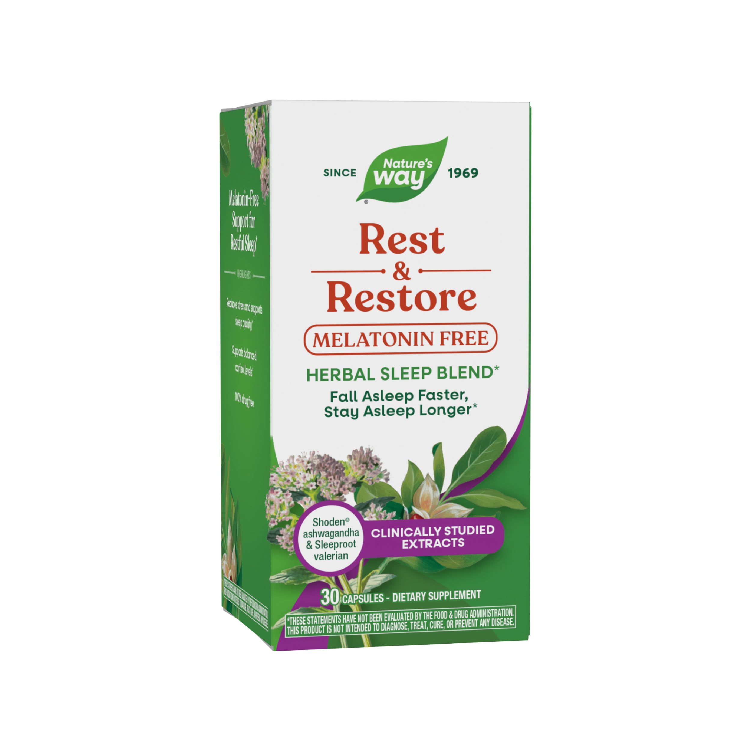 At Nature's Way, we believe nature is the ultimate problem solver. For over 50 years, we have looked to the natural world for inspiration. Our quality vitamins and supplements are formulated to help you find your way to wellness. quality. . Gluten free and vegan. No wheat, corn, soy, egg, peanut, dairy, gelatin, or artificial colors or flavors. Adults take 1 capsule one hour before bedtime. Not formulated for children. With clinically studied Shoden ashwagandha and Sleeproot valerian extracts. Nature's Way Rest Restore is a melatonin-free formula to help you fall asleep faster and stay asleep longer. Reduces stress, supports balanced cortisol levels, and supports sleep. .