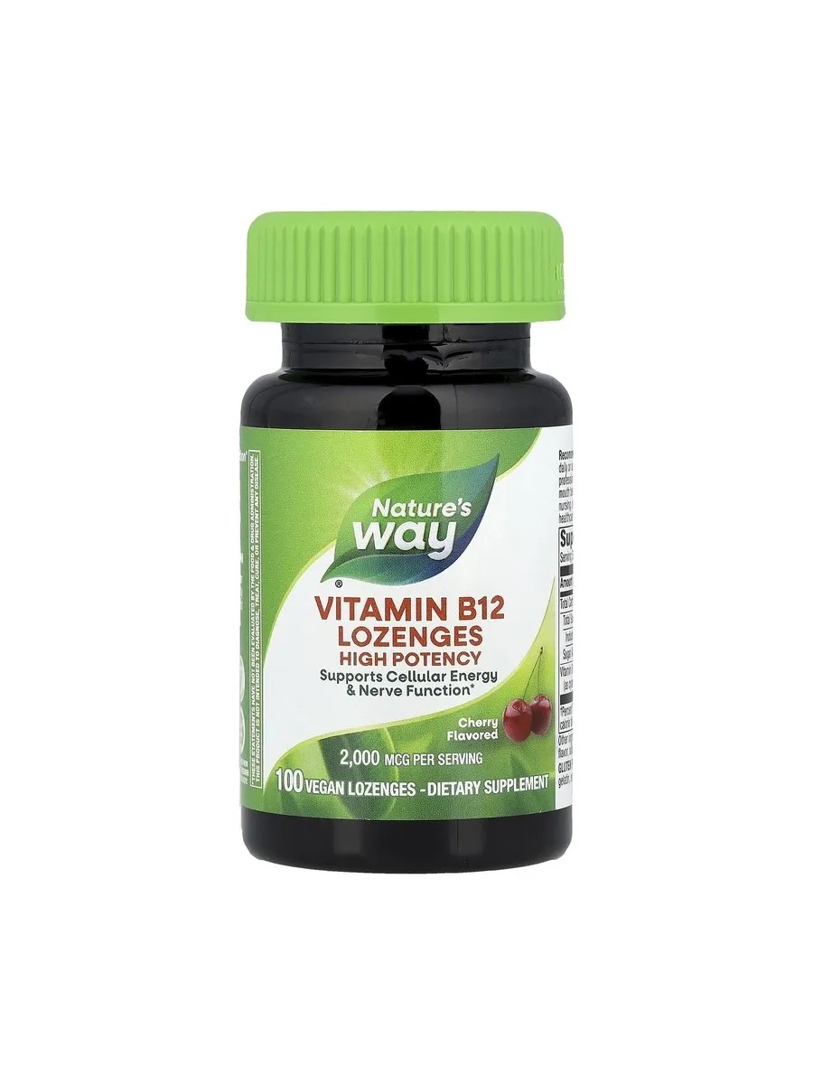 Витамин B12, со вкусом вишни, 2000 мкг, 100 веганских пастилок Nature's Way, Vitamin B12 100 Vegan lozenges - для правильного роста организма, усилит иммунитет и улучшит аппетит, увеличит выработку энергии и поддержит здоровье нервной системы, улучшит память и способность концентрироваться. Витамин В12 от американской компании Nature's Way - пищевая добавка, разработанная для поддержки клеточной энергии и функции нервов. Каждая порция в форме пастилок содержит 2000 мкг этого важного витамина. Витамин Б12 - веганский продукт, подходящий для людей, придерживающихся растительного питания. Убедитесь, что ваш организм получает необходимую поддержку с Витамином В12. Восстановите энергию и поддержите нервную систему с этим натуральным продуктом, созданным природой. Поддерживает энергетический обмен в клетках. Помогает поддерживать здоровье сердечно-сосудистой, иммунной и нервной систем. Помогает вашему организму преобразовывать углеводы, жиры и белки в энергию. Витамин В12 (цианокобаламин) рекомендуется в качестве биодобавки к пище – дополнительного источника витамина В12, относится к витаминной группе водорастворимых. Обладает высокой биологической активностью. Необходим для нормального кроветворения (способствует созреванию эритроцитов). Участвует в процессах трансметилирования, переносе водорода и образовании метионина, нуклеиновых кислот, холина и креатина. Способствует накоплению в эритроцитах соединений, содержащих сульфгидрильные группы. Оказывает благоприятное влияние на функцию печени и нервной системы. Комплекс уменьшает болевые ощущения, связанные с поражением периферической нервной системы, стимулирует нуклеиновый обмен через активацию фолиевой кислоты. Активирует свертывающую систему крови, в высоких дозах вызывает повышение активности тромбопластина и протромбина.