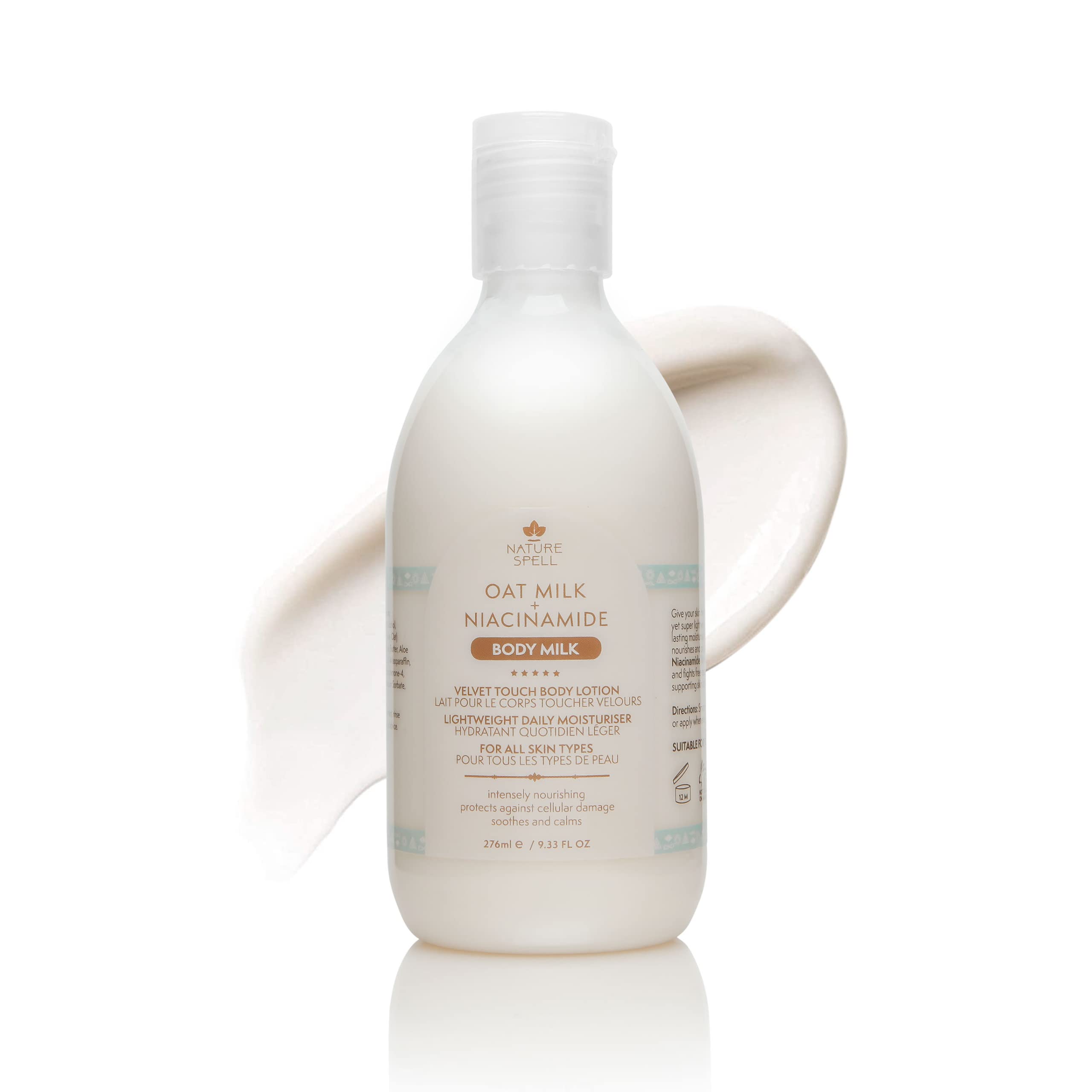 Nature spell oat milk + niacinamide body milk - Velvet touch body lotion - 276ml - immediate hydration - Suitable for all skin types - 100% vegan - Made in Great Britain