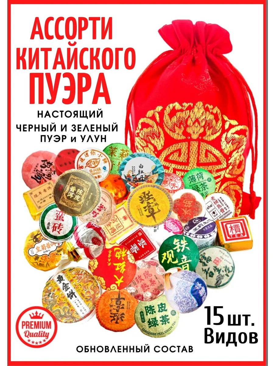 | Комплектация | прессованный чай в мини тоучах - 15 шт.; черный чай; зеленый чай; шу пуэр; Подарочный набор -1 шт.; мешочек атласный красный -1 шт. |