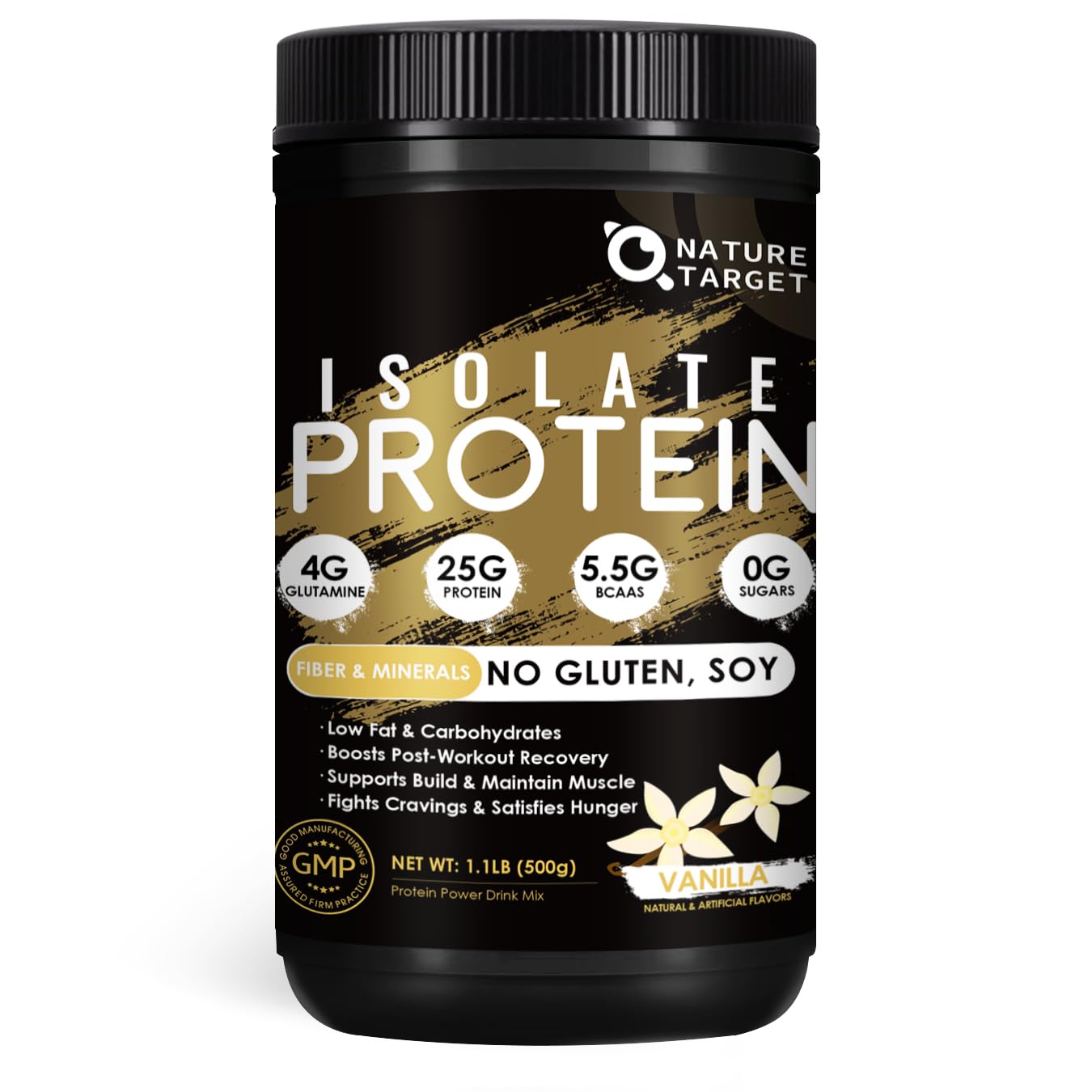 NATURE TARGET Isolate Whey Protein Powder Vanilla 25g Protein Low Carb Sugar-Free & Gluten-Free 5.5g BCAAs Rich in Fibers & Minerals 1.1 Pound 16 Servings Natural Vanilla 1.1 Pound (Pack of 1)