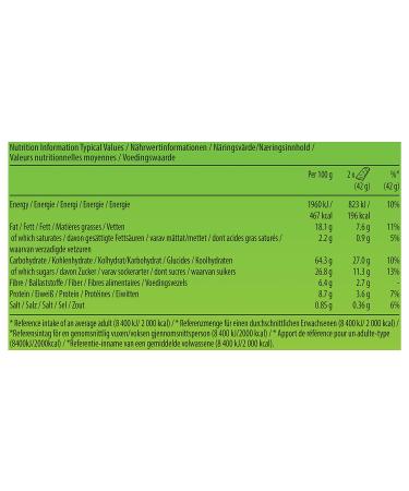 The crunchy bar oat honey combines honey and crispy baked wholemeal flakes into a unique taste that makes it undisputed darling under the crunchy.Our Nature Valley Crunchy Riegel are free of artificial flavors, color and preservatives and with 100 percent whole grain harbor. Ingredients ingredients Ingredients: wholemeal flakes (60 ), sugar, sunflower oil, honey (3 ), dining salt, molasses, emulgator (sunflower lecithin), baking agent (sodium hydrogen carbonate).Can contain soy, wheat, peanuts and shell fruits. Instructions Ready for consumption Warnings not specified Address manufacturer importer Polígono Industrial Fase III, Término Sansande, 31570 San Adrián, Navarra, Spain MoreThe Crunchy Riegel are free of artificial flavors, color and preservatives.Lactose -free, suitable for vegetarians, Halal Koscher.The double bars combine 100 percent whole grain harbor with honey.Nature Valley Crunchy Hafer Honey is a crispy baked double bar.Der Crunchy Riegel Hafer Honig kombiniert Honig und knusprig gebackene Vollkorn-Haferflocken zu einem einzigartigen Geschmack, der ihn zum unbestrittenen Liebling unter den Crunchy Riegeln macht. Unsere Nature Valley Crunchy Riegel sind frei von künstlichen Aromen, Farb- sowie Konservierungsstoffen und mit 100 prozent Vollkorn-Hafer. INHALTSSTOFFE ZUTATEN Zutaten: Vollkorn-HAFERFLOCKEN (60 ), Zucker, Sonnenblumenöl, Honig (3 ), Speisesalz, Melasse, Emulgator (Sonnenblumenlecithin), Backtriebmittel (Natriumhydrogencarbonat). KANN SOJA, WEIZEN, ERDNÜSSE UND SCHALENFRÜCHTE ENTHALTEN. GEBRAUCHSANWEISUNG Verzehrfertig WARNHINWEISE keine Angabe ANSCHRIFT HERSTELLER IMPORTEUR Polígono Industrial Fase III, Término Sansande, 31570 San Adrián, Navarra, Spain MehrDie Crunchy Riegel sind frei von künstlichen Aromen, Farb- und Konservierungsstoffen. Laktosefrei, geeignet für Vegetarier, Halal Koscher. Die Doppelriegel kombinieren 100 prozent Vollkorn-Hafer mit Honig. Nature Valley Crunchy Hafer Honig ist ein knusprig gebackener Doppelriegel.Nature Valley Crunchy Oats Honey, 18x2-Bar Pack (18 x 42g), Müsliriegel, Leckere und gesunde Riegel, Haferriegel, Müsliriegel Großpackung, Köstliche Vollkorn Hafer Riegel ohne Konservierungsstoffe
