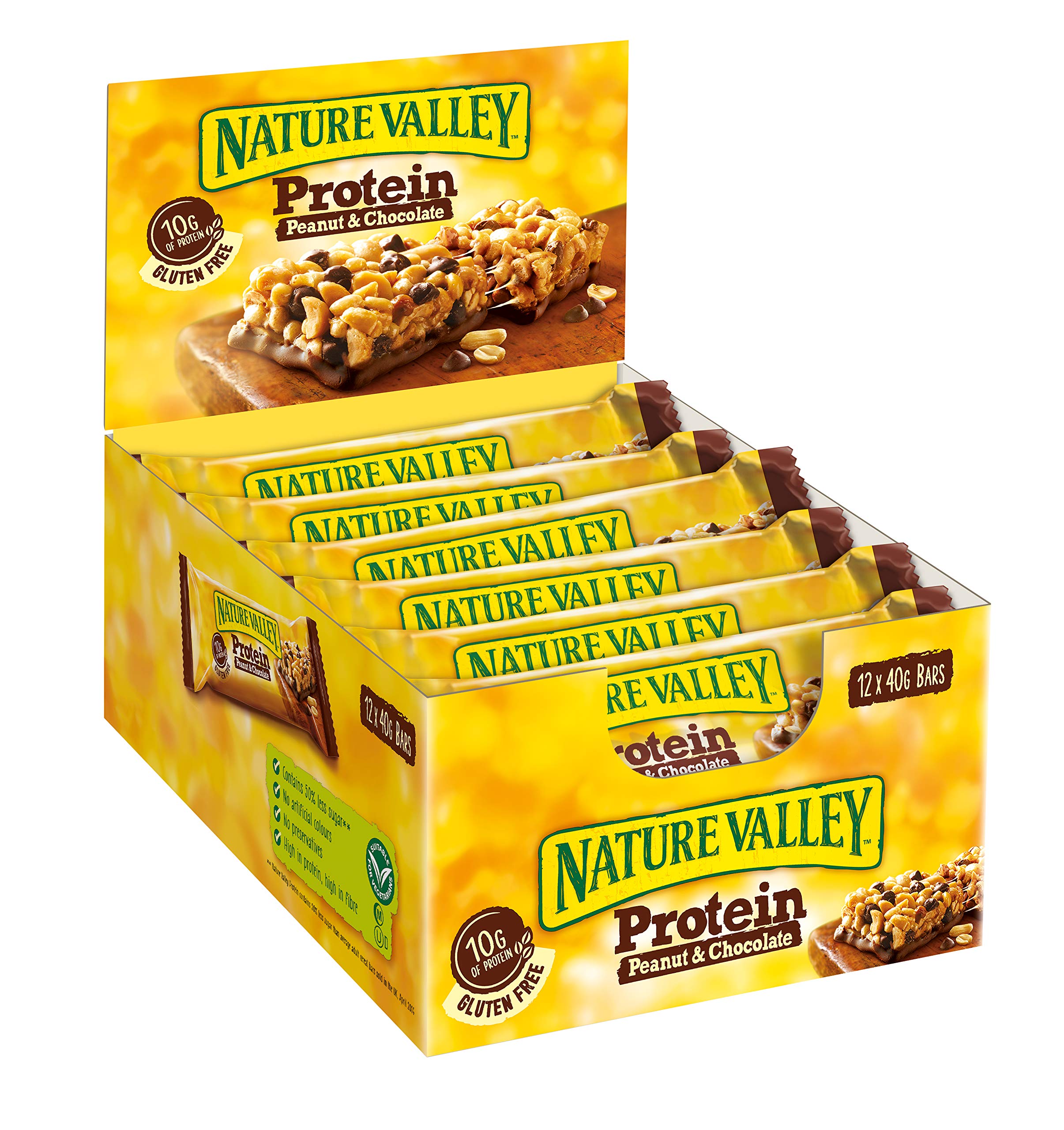 Nature Valleys Peanut and Chocolate Crunchable Protein Bars are made with real peanuts, chocolate chips, and dipped in a chocolate-flavored coating. A great snack between meals when hunger strikes. INGREDIENTS Roasted PEANUTS (39 ), Chicory Root Extract, SOY Protein Isolate, Chocolate Pieces (8 ) (Sugar, Cocoa Mass, Cocoa Butter, Emulsifier: SOY Lecithin), Sugar, Palm Fat, Whey Solids (MILK), Sunflower Oil, Fructose, Glucose Syrup, Buttermilk (2 ), Low-Fat Cocoa Powder, Tapioca Starch, Humectant: Glycerol Salt, Emulsifiers: Sunflower and SOY Lecithin Natural Flavors, Maltodextrin.Nature Valley Nature Valley Protein 12 x 40 g Peanut ChocolatDESCRIPTION DU PRODUIT DESCRIPTION DU PRODUIT Les barres protéinées d'arachide et de chocolat à croquer Nature Valleys sont faites avec de vraies arachides, pépites de chocolat et trempées dans une couche aromatisée au chocolat. Une excellente collation entre les repas lorsque la faim frappe INGRÉDIENTS CACAHETTES grillées (39 ), extrait de racine de chicorée, protéine isolée de SOJA, morceaux de chocolat (8 ) (sucre, masse de cacao, beurre de cacao, émulsifiant : lécithine de SOJA), sucre, graisse de palme, extrait sec de lactosérum (LAIT), huile de tournesol, fructose, sirop de glucose, beurre de UETE (2 ), poudre de cacao faible en gras, amidon de tapioca, humectant: glycérol sel, émulsifiants: lécithine de tournesol et SOJA arômes naturels, maltodextrine.