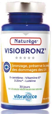 Vegetable capsules dosed with 440 mg. Hydrates, cleanses, beautifies and prolongs the tan. Activates the tan and at the same time protects skin and eyes against UV.Visiobronz 60 capsulesPlantaardige capsules gedoseerd met 440 mg. Hydrateert, reinigt, verfraait en verlengt de bruining. Activeert de bruining en beschermt tegelijkertijd huid en ogen tegen UV.