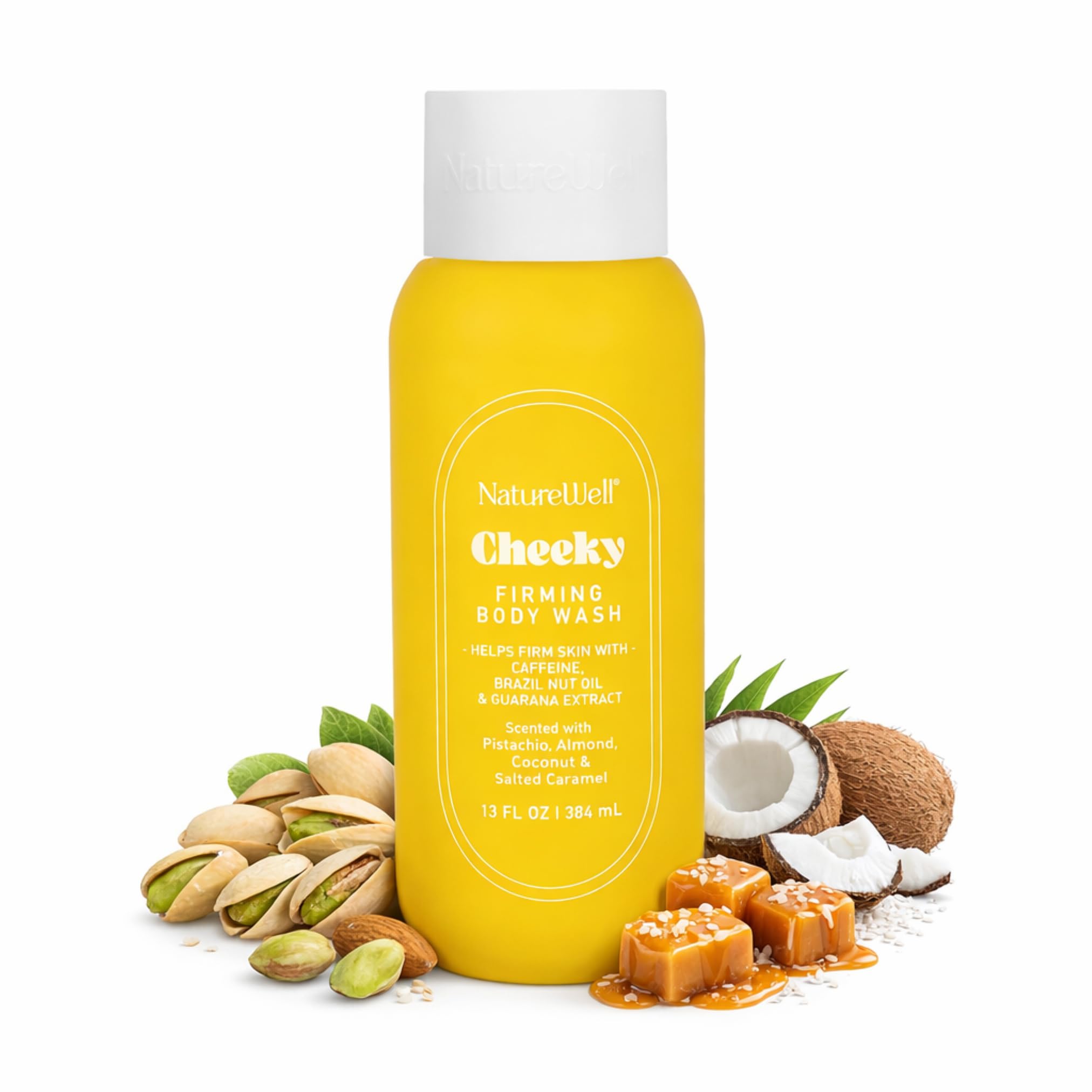 NATURE WELL Cheeky Firming & Cleansing Body Wash Infused With Caffeine Brazil Nut Oil & Guarana Extract Scented With Pistachio Almond Coconut & Salted Caramel 13 Fl Oz