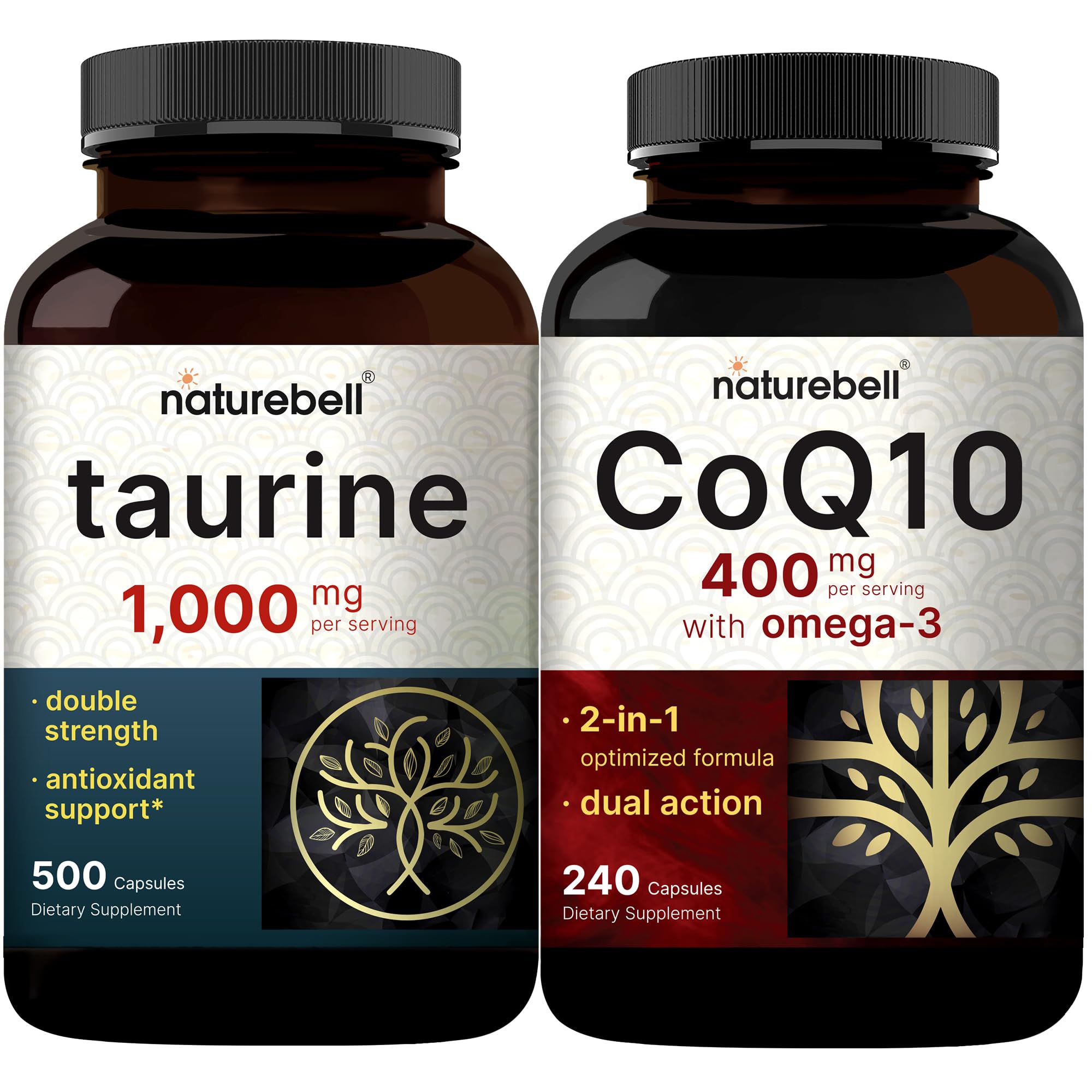 NatureBell CoQ10 400mg with Omega 3 Fatty Acids & Taurine Capsules 1,000mg Per Serving Bundle Pack | Stable High Absorption Form | Essential Amino Acids Supplement
