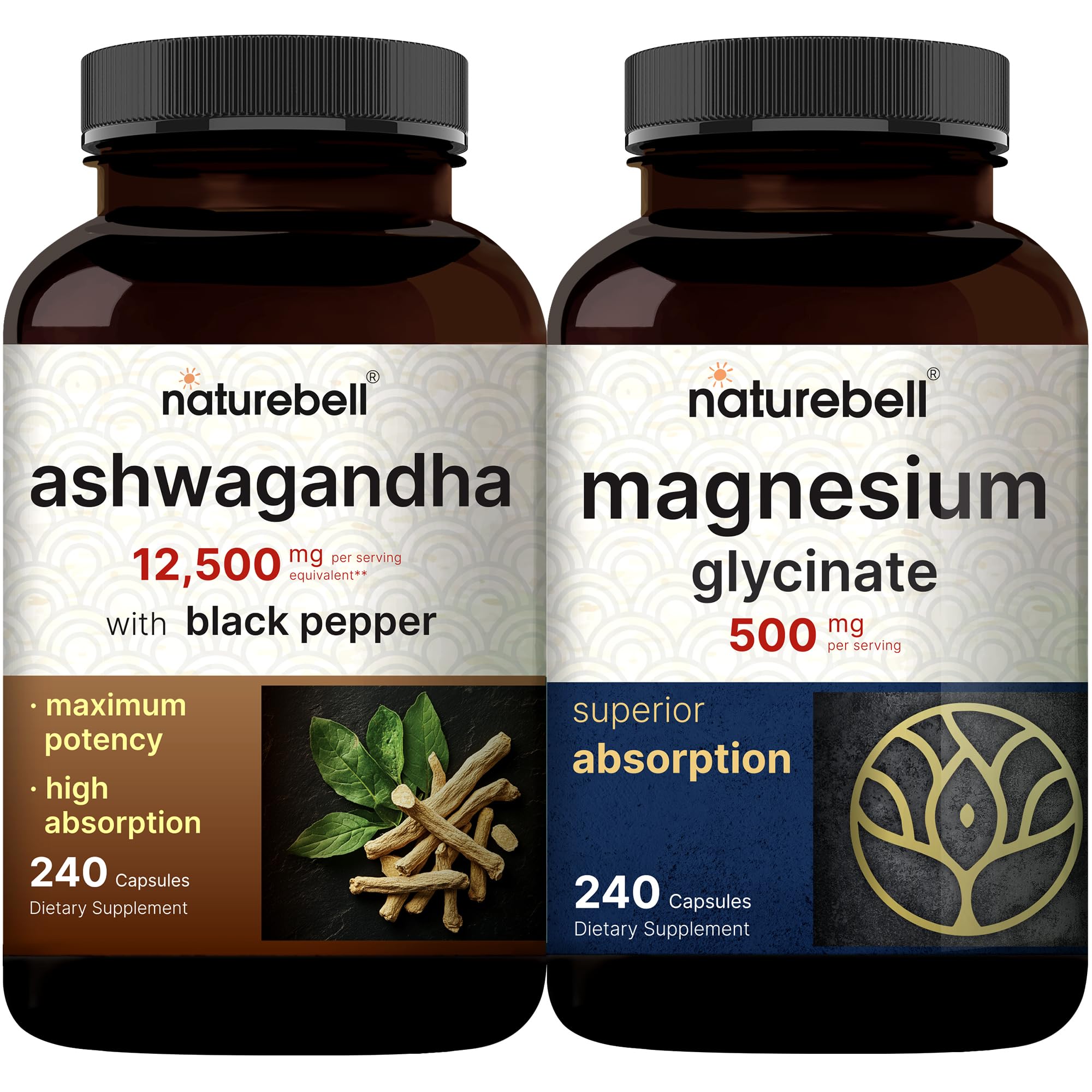 Authentic non-GMO ingredients. Free of wheat, soy, dairy, gluten, eggs, fish, and peanuts. Third party lab tested for safety and potency. Magnesium glycinate offers essential mineral support for energy, joint, and muscle health. The addition of black pepper adds natural piperine, which helps better absorb and utilize ashwagandha’s full spectrum of nutrients. Ashwagandha 240 capsules per bottle, 2 capsule serving size, delivering 12,500 mg ashwagandha combined with 5 mg black pepper per dose, 4-month supply. Magnesium Glycinate 500mg capsules, 240 capsule supply, convenient one a day formula, lasts up to 8 months. Bundle pack of NatureBell’s magnesium glycinate capsules, 100% chelated and purified elemental mineral for max absorption, as well as Max potency 12,500 mg ashwagandha, combined with black pepper extract for enhanced absorption and bioavailability.