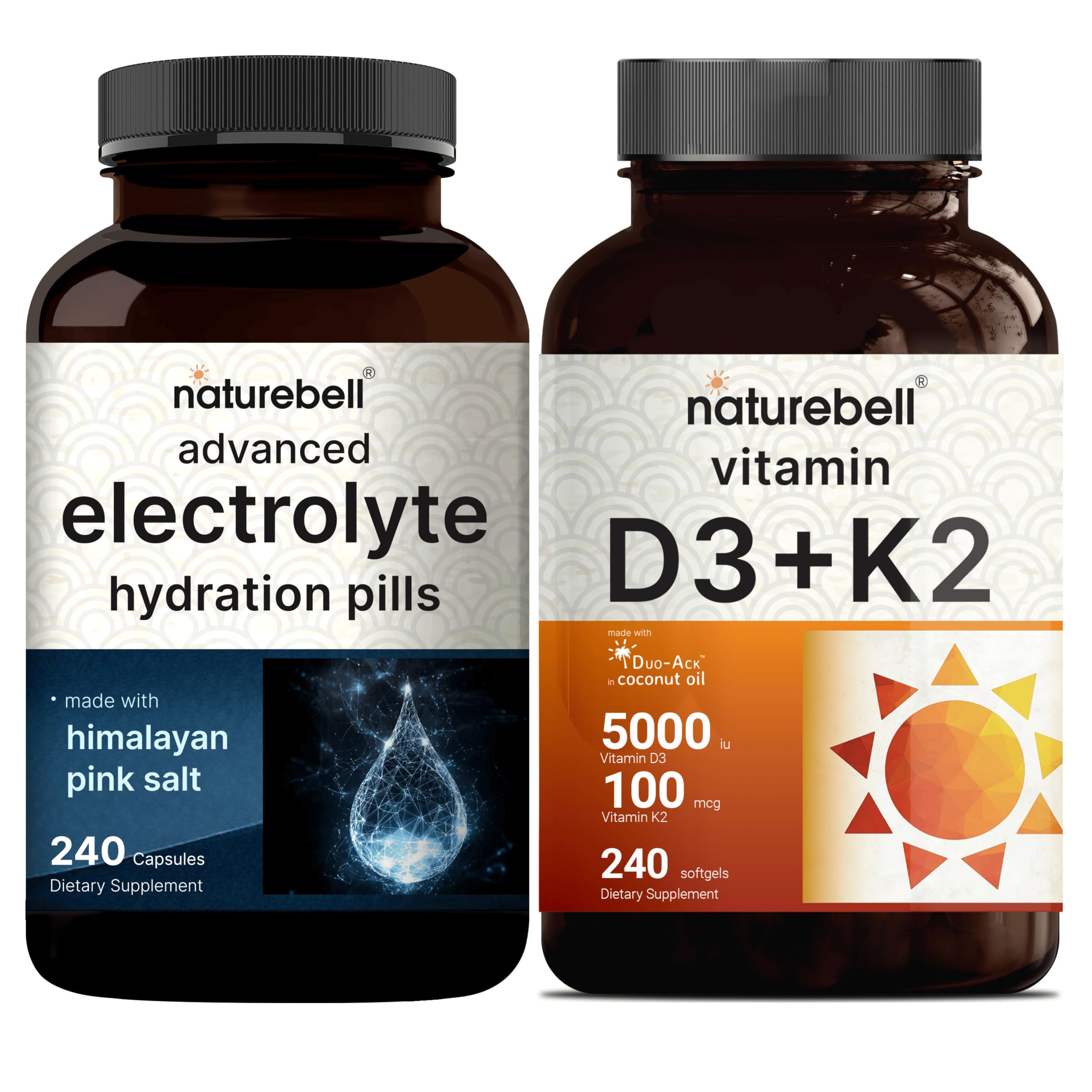 Authentic non-GMO ingredients. Free of wheat, soy, dairy, gluten, and preservatives. Third party lab tested for safety and potency. Vitamin D3 K2 provides sunshine vitamin synergy for the heart and bones, while the electrolytes promote optimal hydration replenishment for daily fluid and electrolyte balance, while also combatting signs of dehydration for a boost in energy and focus. Each serving of Electrolyte Pills provides max support with a 6-in-1 complex of calcium, magnesium glycinate, zinc picolinate, chloride (himalayan pink salt), sodium, and potassium. Vitamin D3 K2, 240 coconut oil softgels, 5,000iu vitamin D3 with 100 mcg of vitamin K2 per serving, convenient one a day formula, lasts up to 8 months. Bundle pack of NatureBell’s vitamin D3 K2 premium Duo Ack formula, infused with virgin coconut oil, with Advanced electrolyte hydration pills, 240 capsules that offer 120 servings per bottle, contains 6 essential minerals for daily hydrating benefits.