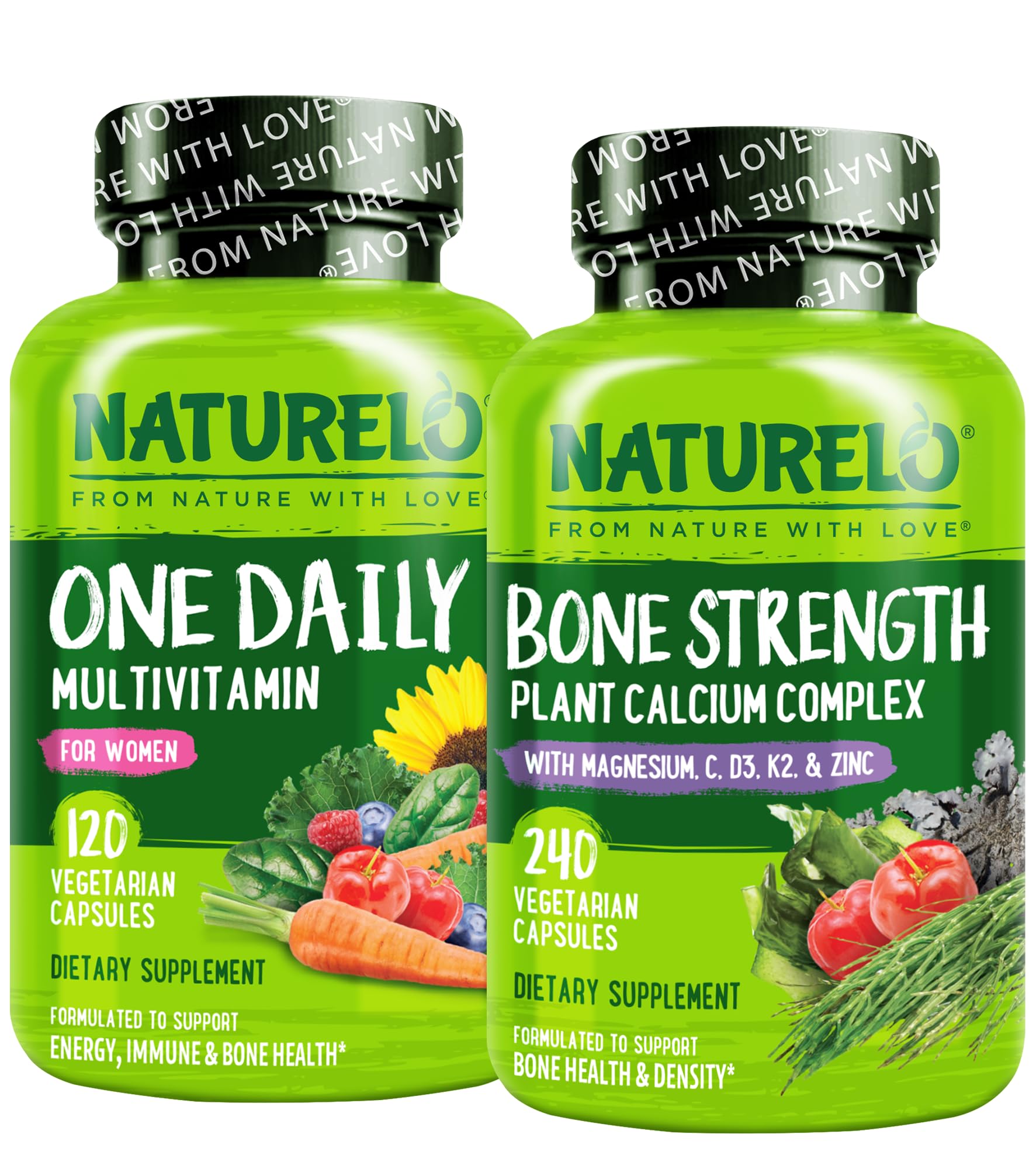 FROM NATURE WITH LOVE: We believe nutrition should come from nature – not a laboratory. We formulate our supplements using only the cleanest, most bioavailable ingredients whenever possible to harness the power of plants for whole food nutrition. CLEAN LABEL: No preservatives, gelatin, coloring or flavoring. Proudly made at a GMP compliant facility. Vegan, Non-GMO, and Soy Free and Gluten Free. HEALTHY BENEFITS: Boost your natural energy and vitality and support your heart, brain, eye, and immune health with vitamins, minerals and organic whole foods to round out your diet and help keep your body functioning at its best. CALCIUM MAGNESIUM ZINC D3 SUPPLEMENT: NATURELO Bone Strength is a calcium, magnesium and zinc supplement enriched with plant-based nutrients to support bone health , including Calcium sourced from marine algae and Vitamin D3 from lichen. PREMIUM PLANT-BASED INGREDIENTS: Nautrelo Whole Food Multivitamins are made with plant-based vitamins and minerals including Vitamin D3 from lichen, Vitamin E from Sunflower, and Calcium and Magnesium from marine algae.