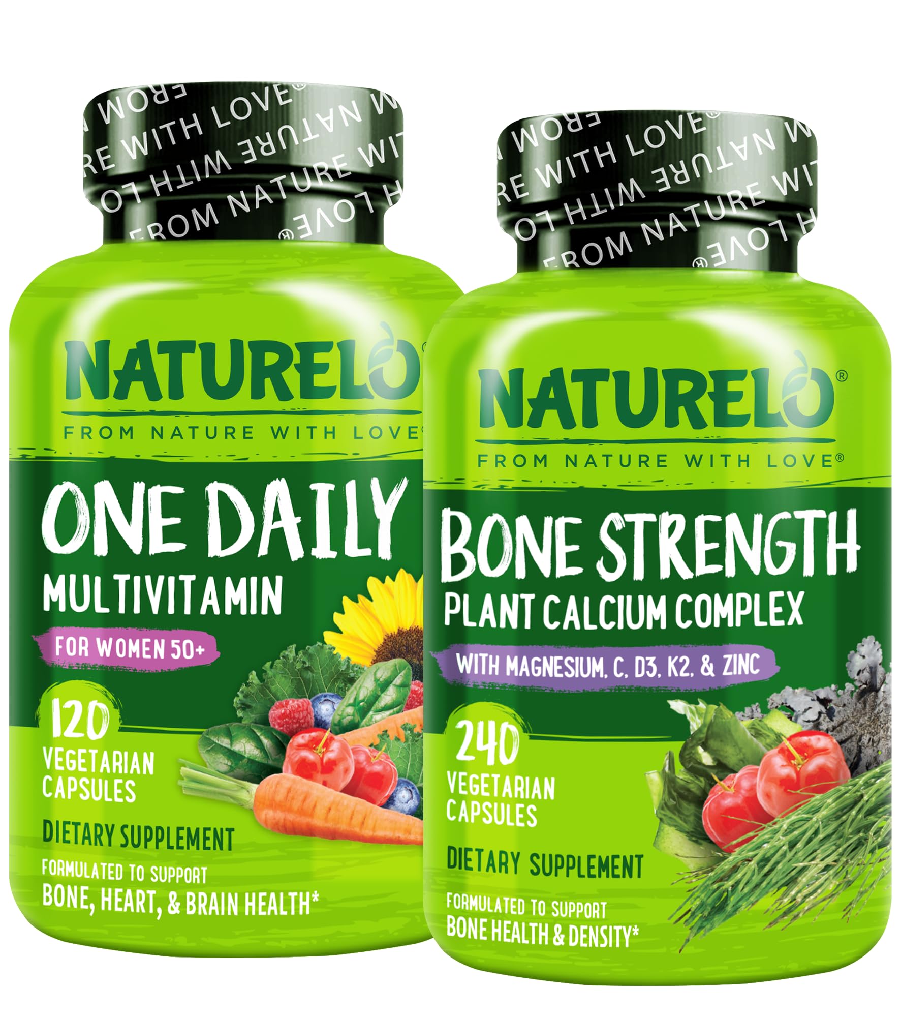 NATURELO Calcium Supplement - for Bone Strength with Calcium 600mg - 240 Vegetarian Capsules and One Daily Multivitamin for Women 50+ (Iron Free) - 120 Capsules - 4 Month Supply Bundle