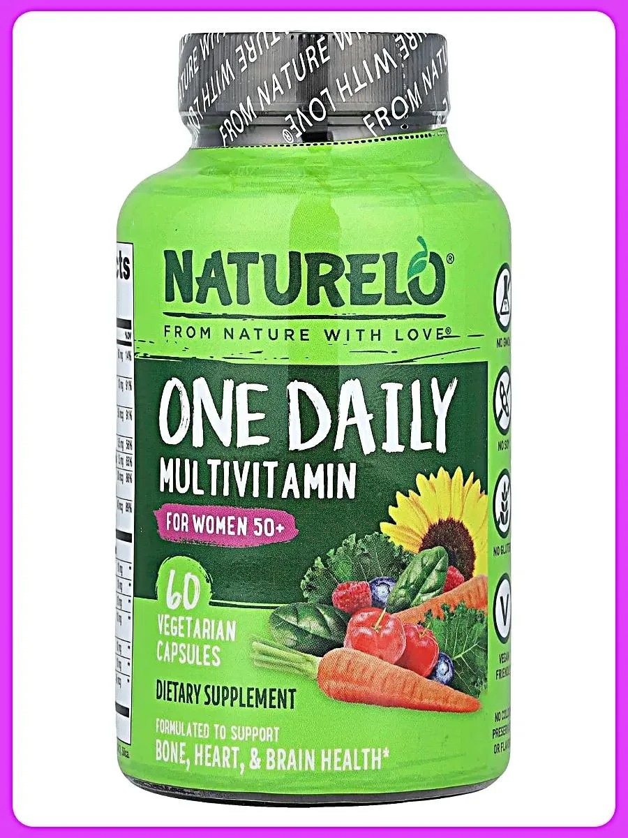 Мультивитамины NATURELO помогают женщинам 50+ лет повысить естественную энергию и жизненный тонус, а также поддерживают правильную работу сердца, мозга, глаз и иммунной системы, чтобы обеспечить нормальное функционирование организма. Способ применения: 1 капсула в день во время еды, запивая полным стаканом воды.