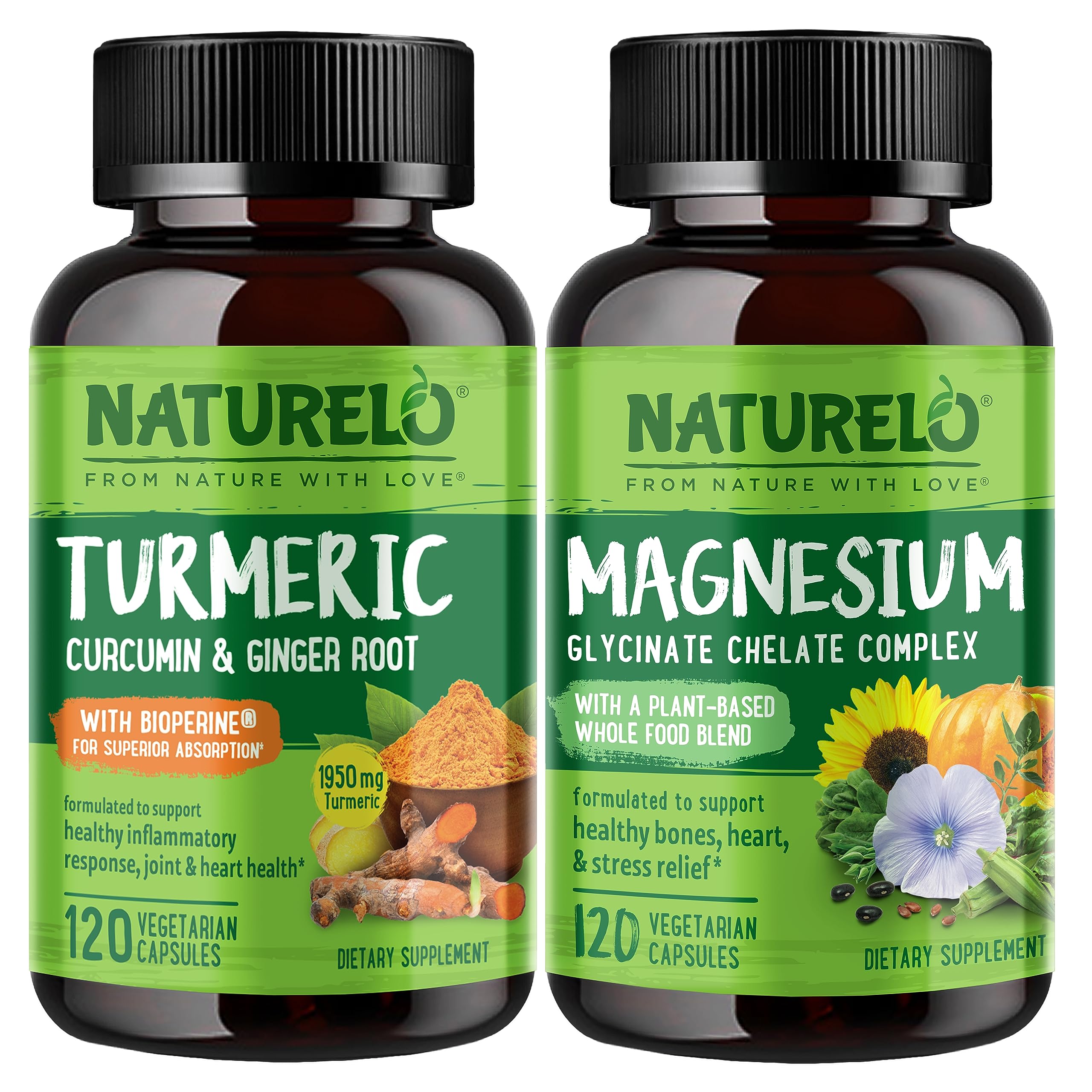 NATURELO Tumeric Curcumin Plant Based Joint Support Magnesium Glycinate 200 mg Magnesium - Gluten Free Non GMO - 120 Capsules