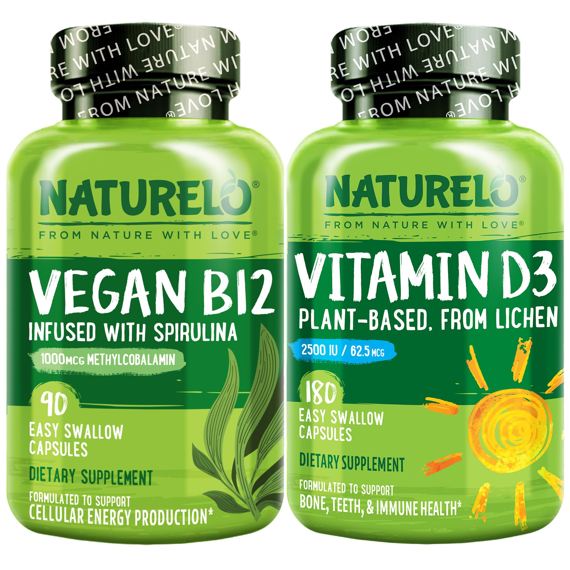 Premium Quality: Non-GMO, Gluten Free, Soy Free, Vegan Vegetarian, with NO Coloring, Flavoring, or Preservatives. Experience the NATURELO difference today!. Naturally Bioactive: Vitamin D-3, or cholecalciferol, is the natural, active form of vitamin D for your body -- the same form of the vitamin that your own body produces in the sun, but without the risky UV exposure. Potent Bioactive: Provides a high potency 1000 mcg dose of vitamin B12 as methylcobalamin, a naturally bioactive, MTHFR-friendly form of the vitamin, which the body can use directly without conversion. Plant-Based Vitamin D3: Most vitamin D3 supplements are made from lanolin secreted from sheep skin. Our Vegan Vitamin D3 is sustainably sourced from wild-harvested lichen with no animal byproducts of any kind. Vegan-Friendly: Vegans and vegetarians are often lacking B12 because of a lack of plant-based food sources. Our vegan B12 made through fermentation provides a perfect source of vitamin B12 for those who don't eat meat.