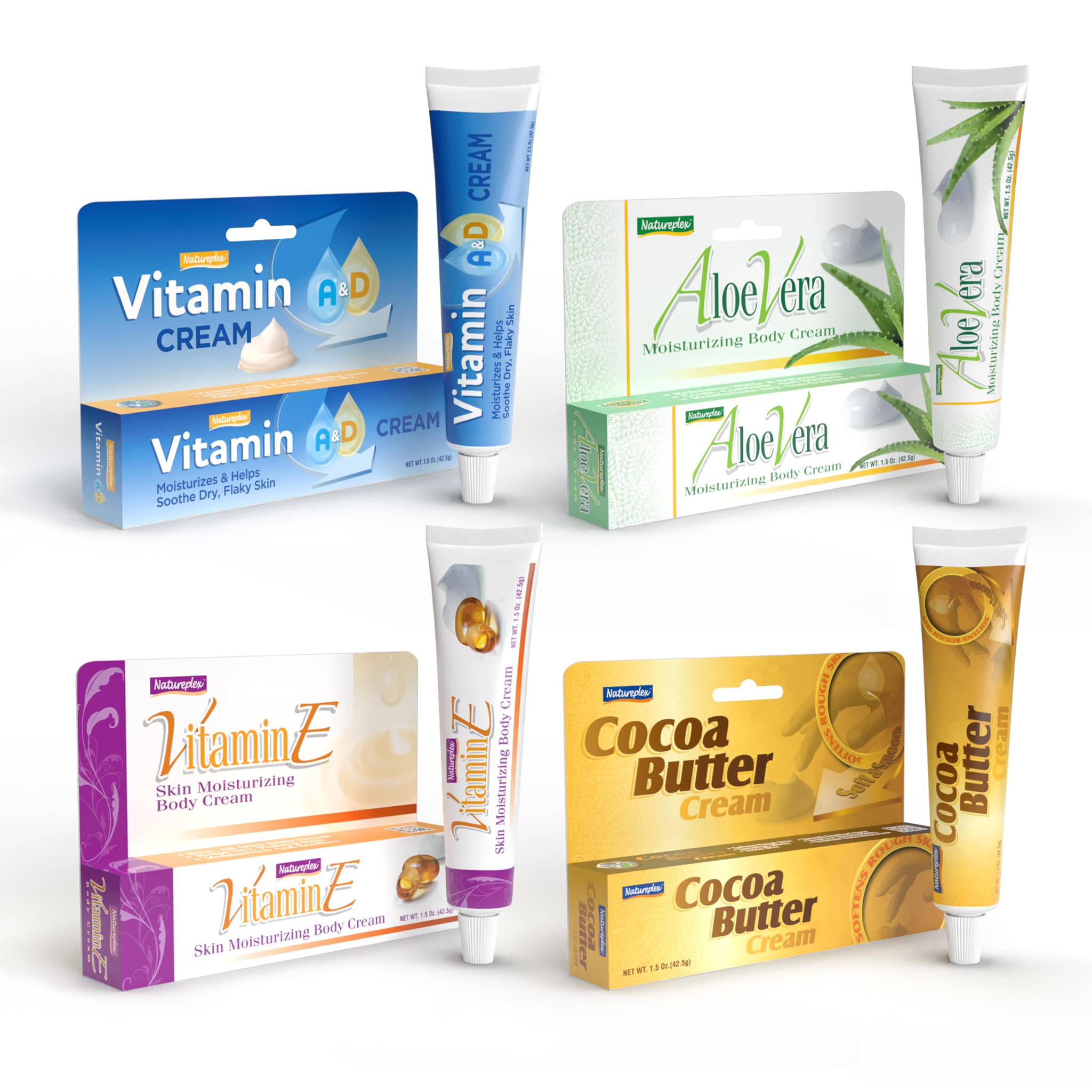 Give your skin the care it deserves with the Natureplex Vitamin Cream Bundle (24 Count) — a nourishing, all-in-one collection of moisturizing creams designed to hydrate, soothe, and soften dry or irritated skin. Each convenient 1.5 oz tube is Made in the USA and crafted with quality ingredients for dependable daily use at home or on the go. This bundle includes 6 each of four Natureplex favorites: Aloe Vera Cream (1.5 oz) for cooling moisture and post-sun care Vitamin E Cream (1.5 oz) to condition and rejuvenate skin Vitamin A D Cream (1.5 oz) to support softness and nourishment and Cocoa Butter Cream (1.5 oz) for deep hydration and smooth texture. Together, these vitamin-rich formulas provide balanced hydration and comfort for the entire family. Perfect for dry hands, rough elbows, heels, and general skincare, each tube is compact, portable, and ideal for travel bags, offices, gyms, schools, or first-aid kits. Keep your skin feeling soft, supple, and refreshed wherever life takes you with this complete, multi-purpose hydration kit from Natureplex. Whether used daily or added to your emergency and travel kits, this 24-count vitamin cream set ensures lasting skin comfort and moisture. Dependable, versatile, and proudly made in the USA — Natureplex keeps your skin nourished, naturally.Made in the USA – Manufactured under strict quality standards for safe, reliable and consistent performance every time. Convenient Travel-Ready Tubes – Compact 1.5 oz size fits easily in bags, purses or first aid kits perfect for on-the-go moisture care. Nourishing Hydrating Formulas – Vitamin-enriched creams help moisturize, soothe and soften dry skin great for face, hands, and body use. Perfect for Dry Winter Skin – Rich, conditioning creams help protect against cold-weather dryness, cracking, and irritation an essential moisturizer set for the winter season. Complete Vitamin Cream Set (24 Count) – Includes 6 each of Aloe Vera, Vitamin E, Vitamin A D Cocoa Butter Creams 1.5 oz tubes perfect for home or travel.