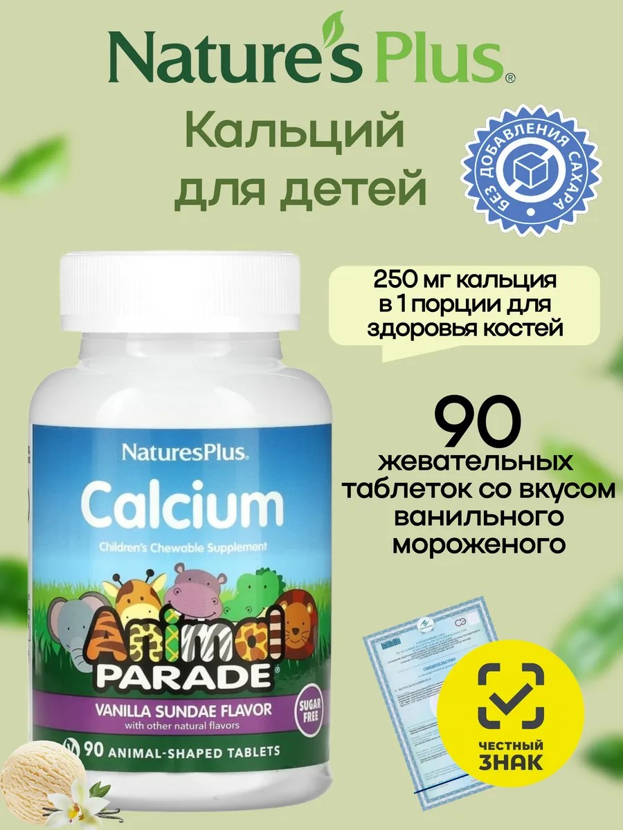 | Торговое наименование | биологически активная добавка к пище "Парад Зверят. Кальций со вкусом ванильного пломбира" "Animal Parade® CALCIUM Chewable - Vanilla Sundae Flavor" (жевательные таблетки массой 1550 мг) |