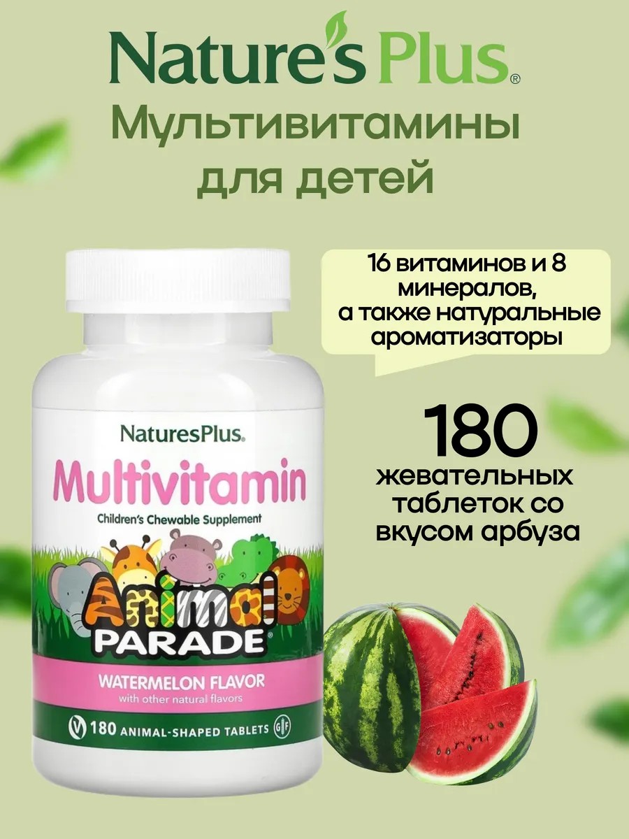 NaturesPlus, Animal Parade, жевательная добавка для детей, со вкусом арбуза, 180 таблеток в форме животных.