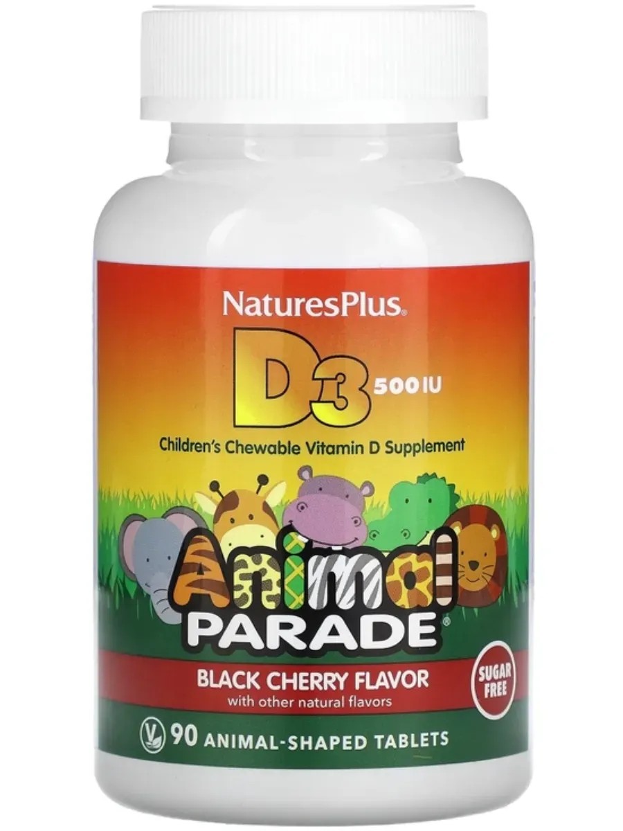 Детские жевательные таблетки Animal Parade с витамином D3 500 МЕ имеют приятный вкус черешни и сделаны в форме животных, которых так любят дети.