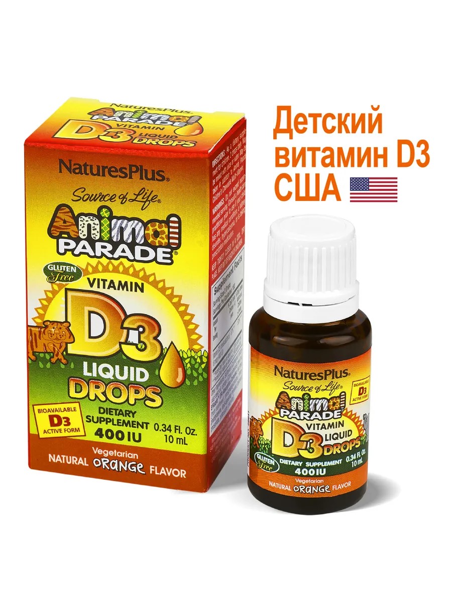 Название из СГР: Парад Зверят. Витамин D3 200 МЕ в каплях для детей с апельсиновым вкусом. Animal Parade Vit. D3 200 IU Liqide Drops ( жидкость во флаконах по 10 мл с дозатором.)