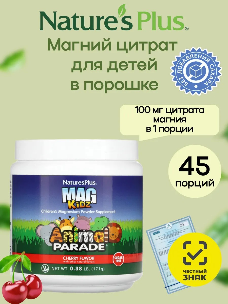 NaturesPlus, Mag Kidz, Animal Parade, добавка с магнием в виде порошка для детей, вкус вишни, 171 г.