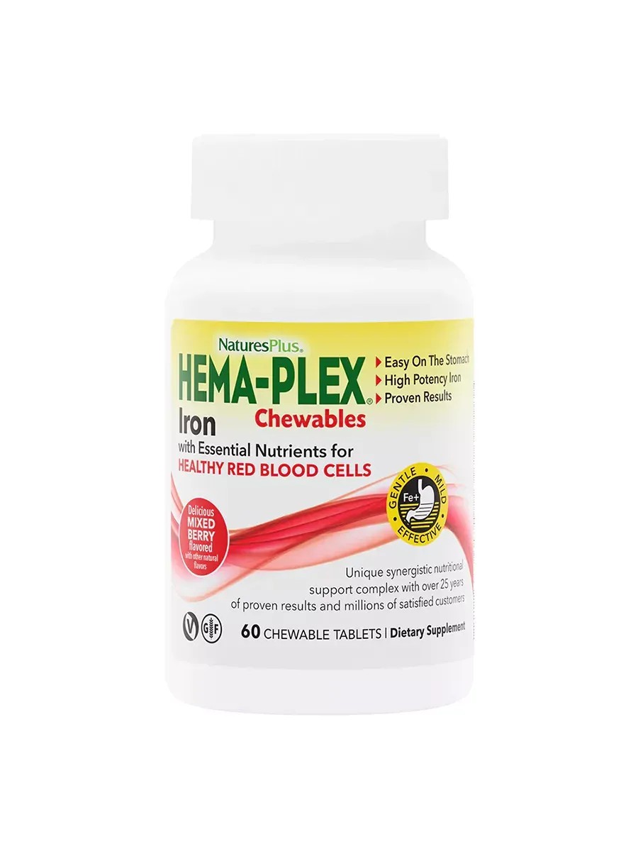 Помимо основного действующего вещества в состав Hema-Plex входят дополнительные ингредиенты, усиливающие его действие. Пластинки имеют ягодный вкус и легко рассасываются, не оставляя следов на зубах. Комплекс содержит в своем составе биофлавоноиды, которые оказывают общеукрепляющее действие и улучшают всасывание основного действующего вещества. Рекомендация по применению: Принимать по 3 таблетки в день.