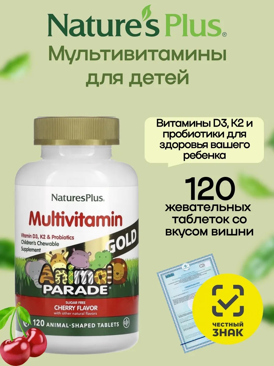 NaturesPlus, Source of Life, Animal Parade Gold, жевательная добавка для детей с мультивитаминами и минералами, натуральный ароматизатор со вкусом вишни, 120 таблеток в форме животных.