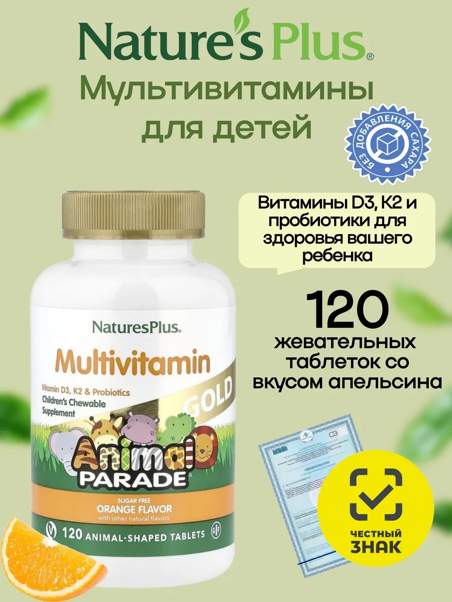 | Полное наименование товара | Мультивитамины для детей Natures Plus Animal Parade, вкус Апельсин, 120 таблеток |