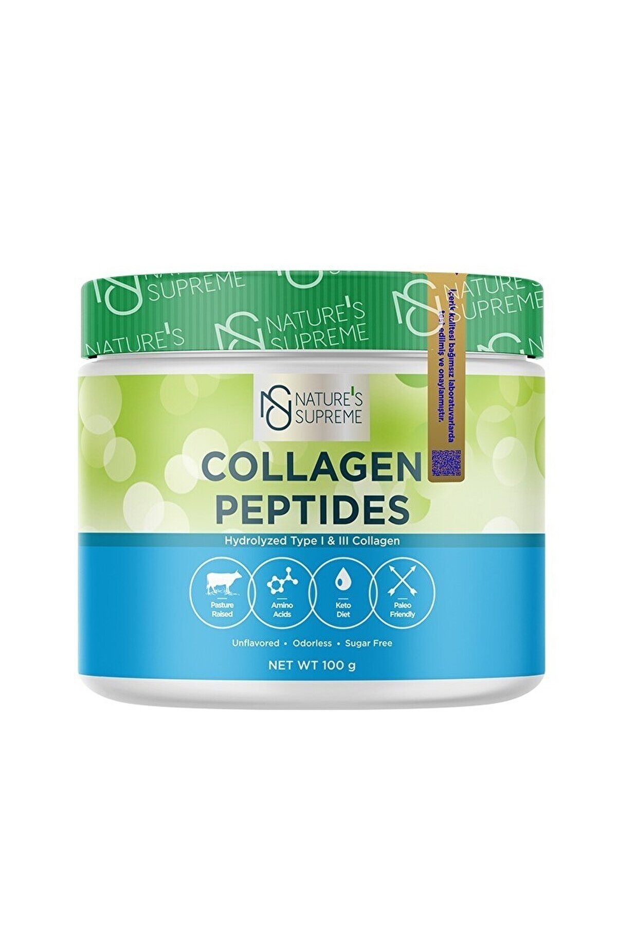 Nature's Supreme Collagen Peptide 0.10 Kg Unflavored Description What is Nature's Supreme Collagen Peptides? Nature's Supreme Collagen Peptides is an easily digestible and highly bioavailable dietary supplement obtained from natural sources. A blend of Type 1 and Type 3 collagen, Nature's Supreme Collagen Peptides contains 91 hydrolyzed collagen protein. Since it is odorless and flavorless, you can mix it with your favorite food or drink and consume it. Nature's Supreme collagen supplement does not contain any additional additives or preservatives. What is Collagen and What Does It Do? Collagen, which makes up almost a third of the human body, is a type of protein. It is a protein needed for the entire body, especially connective tissues, tendons, bones, muscles, and skin. Nature's Supreme Collagen Peptides contains 91 collagen protein. This makes it a good nutritional supplement for those who exercise regularly and follow a high-protein diet (including ketogenic and paleo). Raw Material Quality of Nature's Supreme Collagen Peptides: Natural collagen protein is obtained by enzymatic hydrolysis of collagen-rich meat from grass-fed cattle. Nature's Supreme Collagen Peptides is produced in the form of small collagen protein molecules, which ensures rapid digestion and high bioavailability. The collagen supplement can be easily mixed in hot or cold water. Nature's Supreme Collagen Peptides, offered in powder form, is odorless and flavorless. It does not alter the taste of the food or drink it is added to. It does not contain any preservatives or additives. This natural protein product, owned by Nature's Supreme, is a patented raw material belonging to the "Solugel" brand of PB Gelatins, Argentina's most established and well-known gelatin producer. It is Halal, HACCP, ISO, and Kosher certified. How to Consume Nature's Supreme Collagen Peptides? Nature's Supreme Collagen Peptides' unflavored powder form allows it to be mixed with many drinks or foods consumed throughout the day. Its high protein content (91 ) allows you to enrich your meals with protein. You can easily consume 1 scoop of collagen powder with hot or cold beverages like coffee, ayran, and fruit juice, or with meals like yogurt, smoothies, muesli, or soup. Remarkable Features of Nature's Supreme Collagen Peptides: - 10 g of hydrolyzed Type 1 3 collagen per serving - Contains rapidly absorbed 3000 dalton molecular weight collagen - Production from grass-fed beef - Fast-digesting powder form - 91 high protein content - High bioavailability - 0 sugar - Flavorless and odorless - Easily dissolved in hot or cold water - Halal, HACCP, ISO and Kosher certified - Solugel brand patented Raw material origin: Argentina What Does the Banderol on the Product Mean? The quality banderol on the product indicates that this product has undergone microbiological analysis and tests and that the declared content in the product has been verified. Nature's Supreme has the quality and accuracy of the stated content tested in independent laboratories with TÜRKAK accreditation certificate. These laboratories are among the leading centers for microbiological analysis in Europe. Analyzes are carried out in these advanced laboratories. Nature's Supreme brand maintains this practice in all its product options and has all the necessary analyzes done. Quality Approval Report Beginner Level For adults, you can mix 1 scoop (10 g) with 250 mL of water once a day and consume it. If you wish, you can mix it with your hot or cold beverages such as coffee, ayran and fruit juice, or add it to your meals such as yogurt, muesli and soup. It does not alter the taste of the mixed food. Intermediate Level For adults, you can mix 1 scoop (10 g) with 250 mL of water once a day and consume it. If you wish, you can mix it with your hot or cold beverages such as coffee, ayran and fruit juice, or add it to your meals such as yogurt, muesli and soup. It does not alter the taste of the mixed food. Advanced Level For adults, you can mix 1 scoop (10 g) with 250 mL of water once a day and consume it. If you wish, you can mix it with your hot or cold beverages such as coffee, ayran and fruit juice, or add it to your meals such as yogurt, muesli and soup. It does not alter the taste of the mixed food. Nature's Supreme Collagen Peptides Powder 100g Unflavored Positive Reviews: Highly bioavailable hydrolyzed Type 1-3 collagen, produced from grass-fed beef, Solugel brand patented raw material, contains no artificial sweeteners or flavorings, and can be added to many meals thanks to its odorlessness, suitable for ketogenic and Paleo diets, collagen weight 3000 daltons. Nature's Supreme Collagen Peptides Powder 100g Unflavored Does Not Contain: Aspartame, Pork Additives, GMOs, Gluten, Preservatives, Lactose, Coloring Dye. Age Range: Under 21, Between 21-39, Over 40. Target: Joint Health, Recovery, Recovery. Gender: Male, Female. Active Ingredients: Collagen. Ingredient Type: Powder.