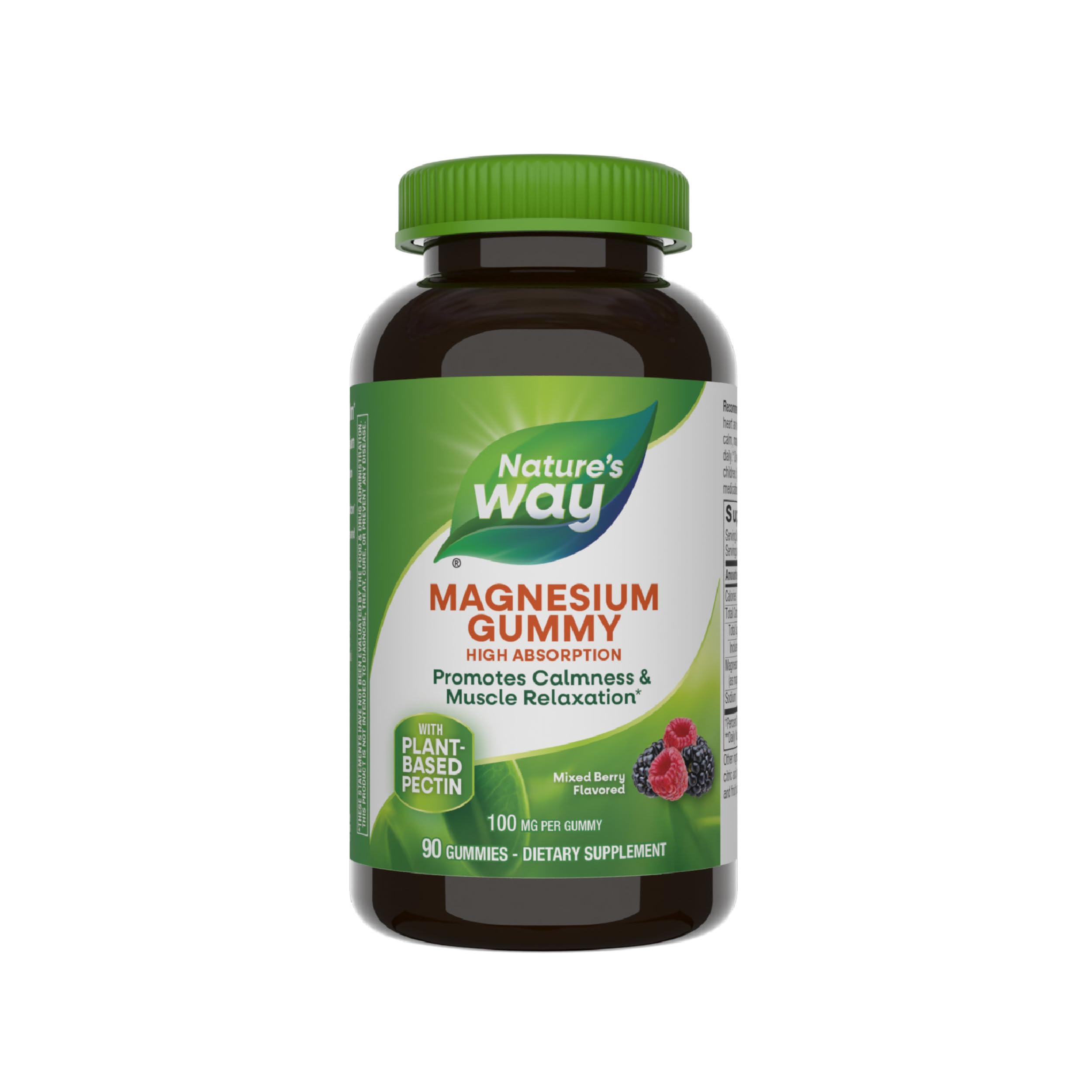 At Nature's Way, we believe nature is the ultimate problem solver. For over 50 years, we have looked to the natural world for inspiration. Our quality vitamins and supplements are formulated to help you find your way to wellness and to reach your full potential. Made with wholesome ingredients: Plant-based pectin, no gelatin. Gluten-free and vegan. No wheat or dairy. Juicy raspberry and blackberry flavored gummies are fun, delicious, and convenient. Adults chew 1-3 great tasting gummies daily. Gummies are formulated with magnesium citrate, a highly absorbable form of magnesium to help replenish stress-depleted magnesium levels. . Nature's Way Magnesium Gummy promotes muscle relaxation with customizable daily dosing: Take one gummy to support muscle relaxation and heart and nerve function or take three gummies to help promote a sense of calm, support a balanced outlook and manage stress. .
