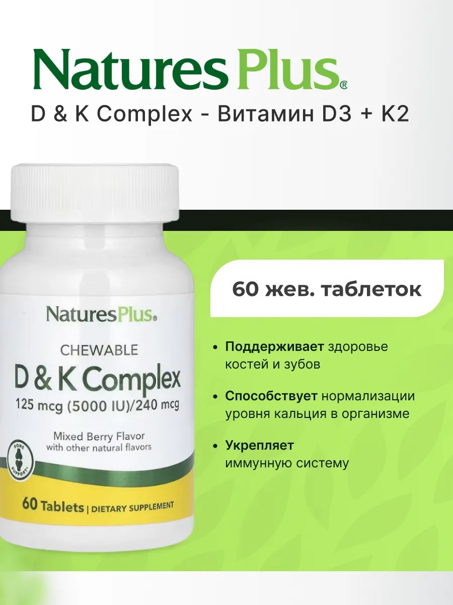NaturesPlus D & K Complex — это высококачественная добавка, содержащая витамины D3 и K2 в удобной форме жевательных таблеток. Витамин D3 (холекальциферол) играет ключевую роль в поддержании здоровья костей и иммунной системы, способствуя усвоению кальция. Витамин K2 (менахинон) важен для правильного распределения кальция в организме, что помогает предотвратить его накопление в артериях и поддерживает здоровье костей.
