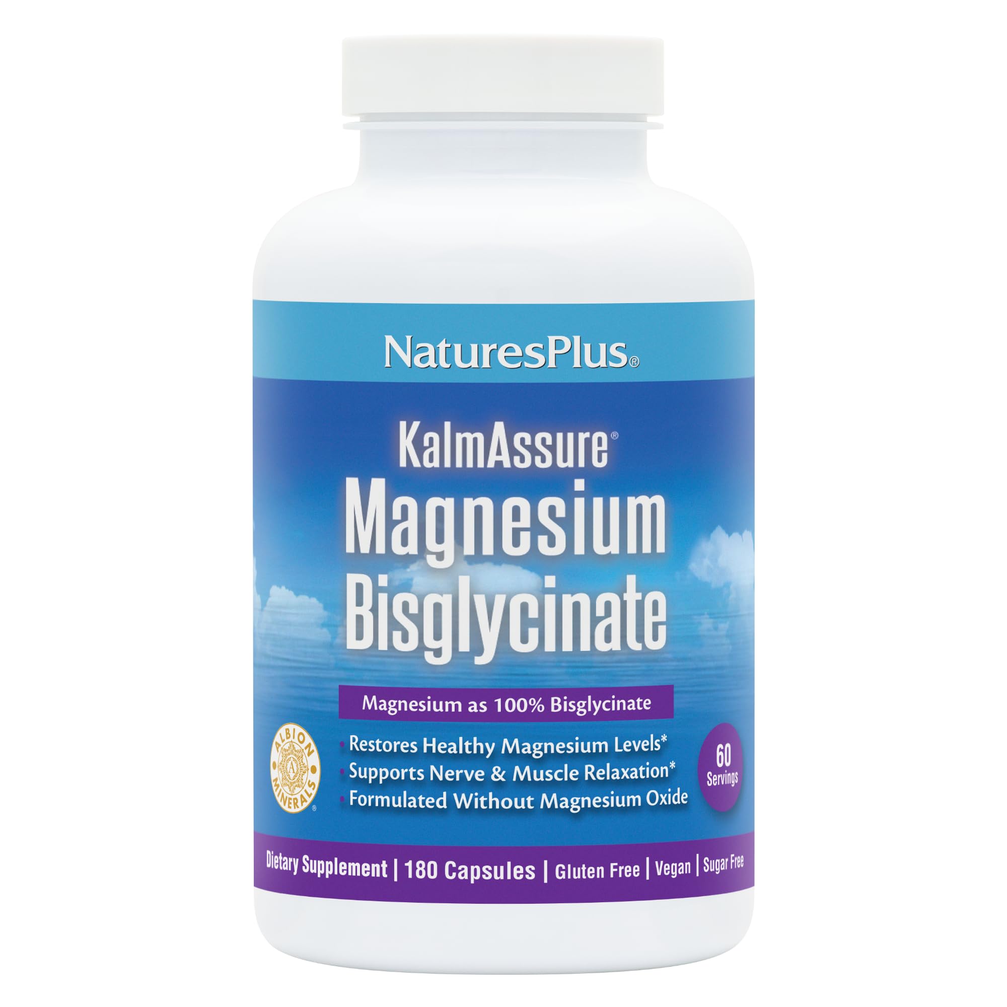 NaturesPlus KalmAssure Magnesium Bisglycinate - 180 Capsules - Supports Nerve & Muscle Relaxation - Formulated Without Magnesium Oxide - 60 Servings