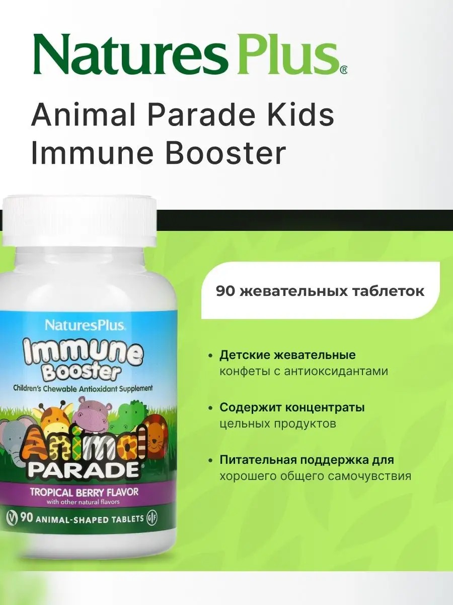 Жевательные таблетки для укрепления детского иммунитета от Animal Parade богаты укрепляющим иммунитет витаминами A, C и E, а также полезным для детского здоровья цинком. Ваши дети полюбят эти веселые жевательные таблетки в форме зверей за их непередаваемый, ароматный тропический вкус. Уникальная смесь цельных растений, включая зеленый чай и листья оливы, обеспечивает дополнительную питательную поддержку для иммунитета, в то время как ацидофилус улучшает состояние пищеварительной системы и обеспечивает оптимальное усвоение питательных веществ.