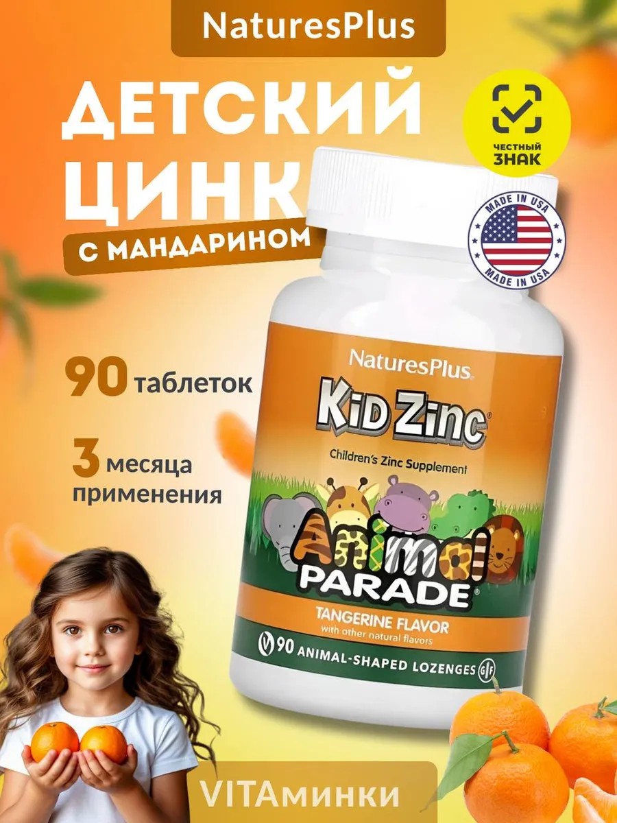 Детский цинк Animal Parade Kid Zinc от Natures Plus - это цинк для детей в форме животных, имеют тщательно подобранный состав, в котором взаимодействуют две формы органического хелатного цинка и активных растительных элементов. Добавки детского цинка очень эффективны во время простудных болезней. Их употребление снижает продолжительность и выраженность симптомов ОРВИ, а систематический прием цинка в профилактических целях позволяет предотвратить инфекционные болезни. Цинк также оказывает противовоспалительное, антибактериальное и ранозаживляющее воздействие. Параллельно с этим он участвует в формировании костной ткани, что очень полезно для костей и зубов. Они становятся крепкими и плотными, менее подвергаются механическим повреждениям. Это отличная профилактика кариесу. Добавка положительно влияет на умственные способности, способствует здоровому кровообращению, достаточному уровню энергии и здоровью обмена веществ. Пастилки Kid Zinc также содержат успокаивающую комбинацию травяных экстрактов, в том числе эхинацеи, оливкового листа, красного вяза и имбиря, которые веками используются практикующими врачами.
