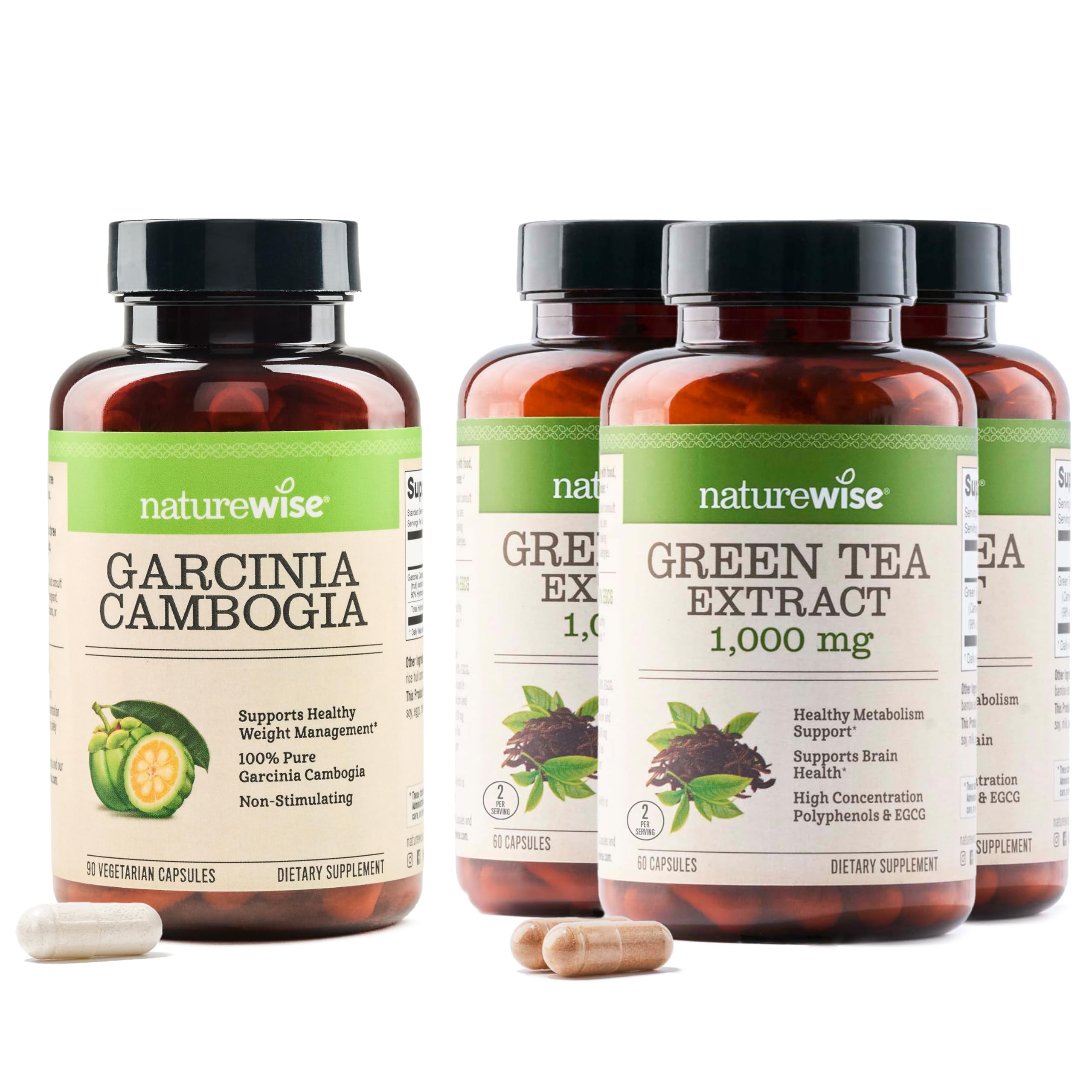 NatureWise Garcinia Cambogia delivers an effective dosage of natural garcinia cambogia extract. This garcinia cambogia extract has been standardized to 60 HCA or hydroxycitric acid, which is the active component in the fruit that may support your weight goals and eating habits. Our Garcinia Cambogia Extract is produced in a GMP-certified facility and undergoes rigorous testing to ensure its purity and potency. It is suitable for both men and women seeking a natural and effective supplement to help them in their weight goals. These garcinia cambogia capsules are vegan, with natural fruit extract in a vegetable capsule. This supplement may help you in your weight goals if you take it as directed, along with a healthy diet and active lifestyle. Green tea is rich in polyphenols that support energy levels, cognitive function, and overall health. NatureWise Green Tea Extract capsules use a high-concentration green tea extract that's been standardized to contain 98 polyphenols and 50 EGCG. EGCG is known to support heart health, cellular health, and brain function. Green Tea Extract also supports your energy levels and mental clarity throughout the day. With around 30 mg of caffeine in every serving, the equivalent of a third of a cup of 8-ounce coffee, Green Tea Extract gives you a small boost to help you get through the day. This product is vegan, gluten-free, and does not contain wheat, eggs, soy, dairy, tree nuts, peanuts, fish, shellfish, or sesame. Statements regarding dietary supplements have not been evaluated by the FDA and are not intended to diagnose, treat, cure, or prevent any disease or health condition."PREMIUM INGREDIENTS: These NatureWise supplements are manufactured in the USA with high-quality ingredients from around the world in a cGMP-certified facility with third-party quality control audits. NON-GMO VEGAN: These NatureWise supplements are vegan, non-GMO, gluten-free, and does not contain wheat, eggs, soy, dairy, tree nuts, peanuts, fish, shellfish, or sesame. 50 EGCG AND 98 POLYPHENOLS: Green Tea Extract has been standardized to contain a minimum of 50 EGCG and 98 polyphenols for rich antioxidant support of cognitive function, immune health, and heart health. . SUPPORTS WEIGHT GOALS: When taken as directed, with a healthy diet and active lifestyle, this supplement may support your weight goals. . ENERGY ANTIOXIDANT SUPPORT: Green tea extract is rich in antioxidants, and also supports healthy energy levels with about 30mg of occurring caffeine per serving. . 60 HCA: Garcinia Cambogia is standardized to 60 hydroxycitric acid, the active component in this fruit extract that may support weight management goals and healthy eating habits. . EXTRA STRENGTH GREEN TEA EXTRACT: Our green tea extract capsules are made with clean, highly concentrated green tea extract at an extra strength dose of 1000 mg of green tea extract per serving of 2 capsules. NATURAL GARCINIA CAMBOGIA EXTRACT: Our Garcinia Cambogia capsules are made of natural, clean garcinia cambogia extract with a high and safe potency.