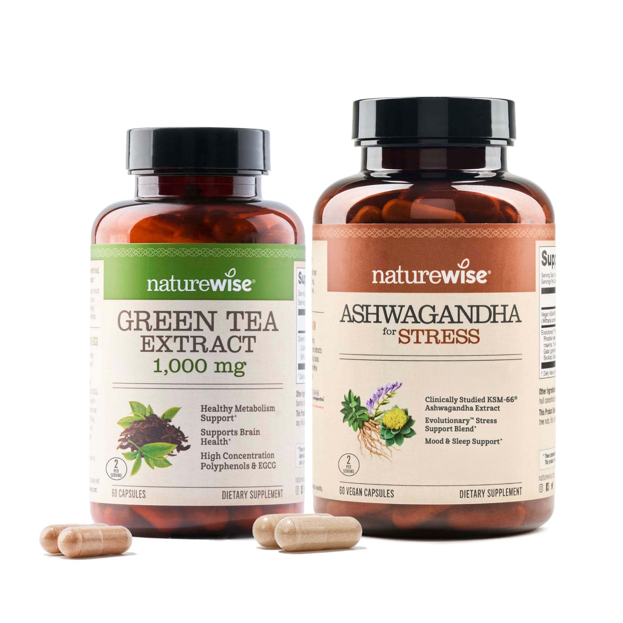 Green tea is rich in polyphenols that support energy levels, cognitive function, and overall health. NatureWise Green Tea Extract capsules use a high-concentration green tea extract that's been standardized to contain 98 polyphenols and 50 EGCG. EGCG is known to support heart health, cellular health, and brain function. Green Tea Extract also supports your energy levels and mental clarity throughout the day. With around 30 mg of caffeine in every serving, the equivalent of a third of a cup of 8-ounce coffee, Green Tea Extract gives you a small boost to help you get through the day. This product is vegan, gluten-free, and does not contain wheat, eggs, soy, dairy, tree nuts, peanuts, fish, shellfish, or sesame. " NatureWise Ashwagandha for Stress is a premium blend of studied herbs and nutrients designed to promote a healthy stress response and better sleep quality. Ashwagandha is an adaptogenic herb that has been shown in studies to support overall sleep quality, stress response, and mood. This supplement also features the Evolutionary Stress Support Blend which contains Rhodiola, L-Theanine, GABA, and Chinese Skullcap. Support yourself in times of stress with this blend of quality herbal ingredients curated for complete stress support. NatureWise Ashwagandha for Stress is vegan, gluten-free, and does not contain wheat, gluten, eggs, soy, dairy, tree nuts, peanuts, fish, or shellfish. Statements regarding dietary supplements have not been evaluated by the FDA and are not intended to diagnose, treat, cure, or prevent any disease or health condition.PREMIUM INGREDIENTS: These NatureWise supplements are manufactured in the USA with high-quality ingredients from around the world in a cGMP-certified facility with third-party quality control audits. NON-GMO VEGAN: These NatureWise supplements are vegan, non-GMO, gluten-free, and does not contain wheat, eggs, soy, dairy, tree nuts, peanuts, fish, shellfish, or sesame. L-THEANINE GABA: This stress-support formula contains L-Theanine and GABA, which are both supportive of sleep quality. . 50 EGCG AND 98 POLYPHENOLS: Green Tea Extract has been standardized to contain a minimum of 50 EGCG and 98 polyphenols for rich antioxidant support of cognitive function, immune health, and heart health. . RHODIOLA CHINESE SKULLCAP: Our Ashwagandha for Stress is formulated with rhodiola which is another adaptogenic herb, and Chinese Skullcap, which is rich in antioxidants. . ENERGY ANTIOXIDANT SUPPORT: Green tea extract is rich in antioxidants, and also supports healthy energy levels with about 30mg of occurring caffeine per serving. . KSM-66 ASHWAGANDHA: Every serving contains 600 mg of clinically studied KSM-66 Ashwagandha Root Extract, a high-concentration extract of this adaptogenic herb. EXTRA STRENGTH GREEN TEA EXTRACT: Our green tea extract capsules are made with clean, highly concentrated green tea extract at an extra strength dose of 1000 mg of green tea extract per serving of 2 capsules.