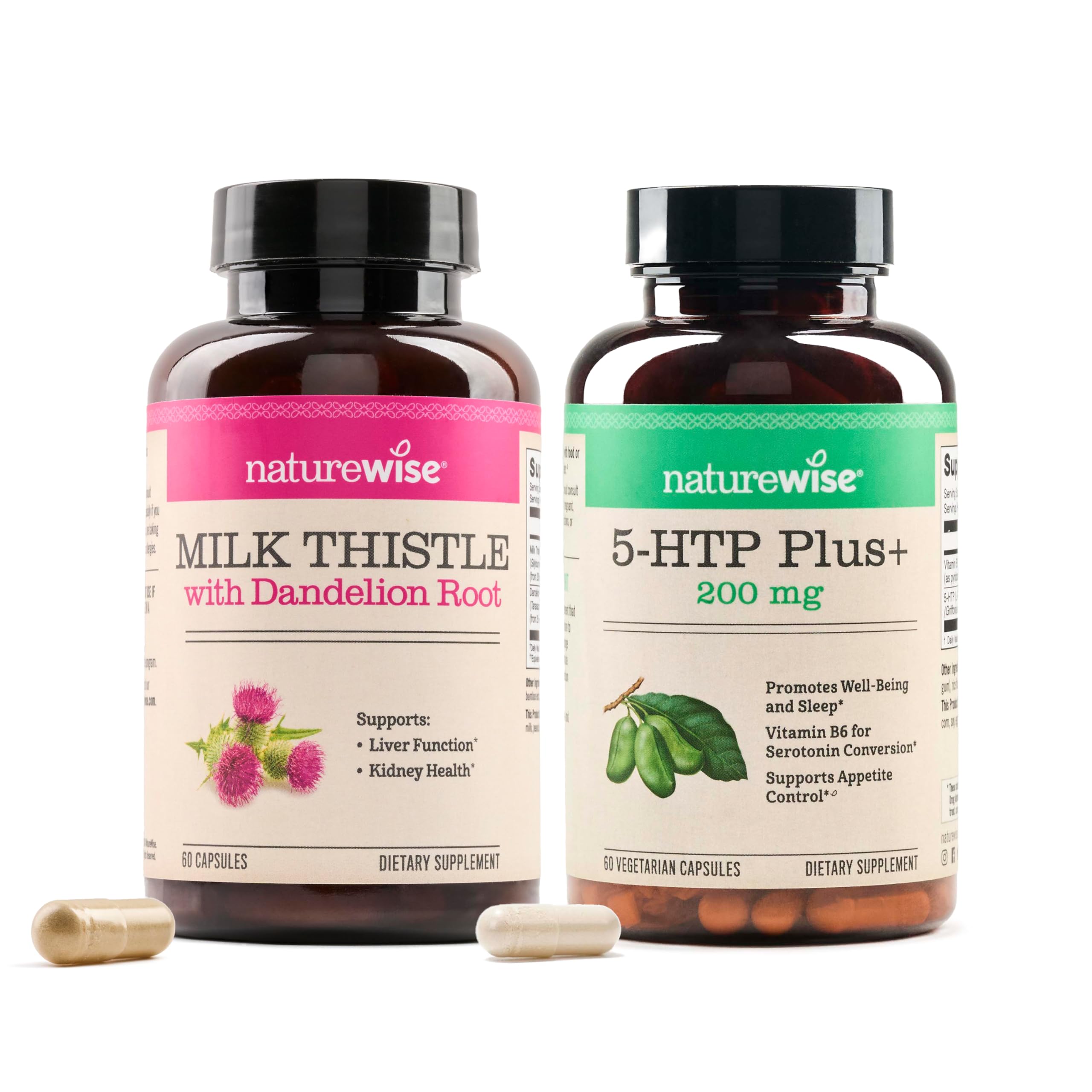 NatureWise Milk Thistle Capsules are here to support your liver function and help maintain daily liver health. Each vegan capsule delivers the equivalent of 1,000 mg of milk thistle derived from a potent 4:1 extract, ensuring maximum support. Complementing this is the equivalent of 100 mg of dandelion root extract, also standardized to a 4:1 potency, for added antioxidant benefits. Together, these herbal ingredients provide a comprehensive solution for those looking to maintain or support liver health. NatureWise Milk Thistle capsules are formulated with care, and free from artificial colors, flavors, and GMOs. These milk thistle capsules are vegan, and do not contain wheat, gluten, dairy, eggs, soy, tree nuts, peanuts, fish, shellfish, or sesame. NatureWise sourced 5-HTP from the seeds of the Griffonia plant, making it a vegan source of 5-HTP. 5-HTP supports sleep and mood. Taking a 5-HTP supplement can support balanced mood and sleep quality. We used vegan, delayed-release capsules for slow release of 5-HTP throughout the day and better digestion. Our 5-HTP 200mg also contains cofactor vitamin B6 for optimal conversion and effectiveness, since vitamin B6 acts as a crucial coenzyme for 5-HTP. Using all clean, non-stimulating ingredients, NatureWise 5-HTP Plus is a great addition to your daily routine. Statements regarding dietary supplements have not been evaluated by the FDA and are not intended to diagnose, treat, cure, or prevent any disease or health condition.Statements regarding dietary supplements have not been evaluated by the FDA and are not intended to diagnose, treat, cure, or prevent any disease or health condition. DELAYED RELEASE CAPSULE: Since other 5-HTP supplements may cause nausea, this 5 HTP supplement comes in a delayed release capsule to slowly support you throughout the day. 3rd PARTY TESTED, QUALITY ASSURED: These NatureWise supplements are manufactured in the USA with high-quality ingredients from around the world in a cGMP-certified facility with third-party quality control audits. PLANT-BASED SLEEP AID: This 5-HTP also works as a drug-free sleep aid, and can support your sleep cycle and helping you obtain restful sleep. . SUPERIOR FORMULATION: NatureWise Milk Thistle capsules are fully vegan, with no artificial colors or flavors, or GMOs. They do not contain wheat, dairy, gluten, eggs, dairy, soy, tree nuts, peanuts, fish, shellfish, or sesame. MOOD SUPPORT: 5-HTP is an amino acid that may support a balanced mood. The body produces 5-HTP via the consumption of meat dairy, making this vegan formula suitable for those with strict dietary restrictions. HIGH POTENCY MILK THISTLE DANDELION ROOT: Each capsule delivers the equivalent of 1,000 mg of milk thistle (from 250 mg of 4:1 extract) to provide potent liver support and the equivalent of 100 mg of dandelion root (from 25 mg of 4:1 extract) for additional benefits. . MAXIMUM POTENCY FORMULA: NatureWise 5-HTP Plus delivers a potent 200 mg dose of 5-HTP enhanced with vitamin B6 for better conversion and effectiveness. . LIVER HEALTH SUPPORT: The liver supplement helps support the body in cleansing the liver and converting nutrients into substances it can use. .