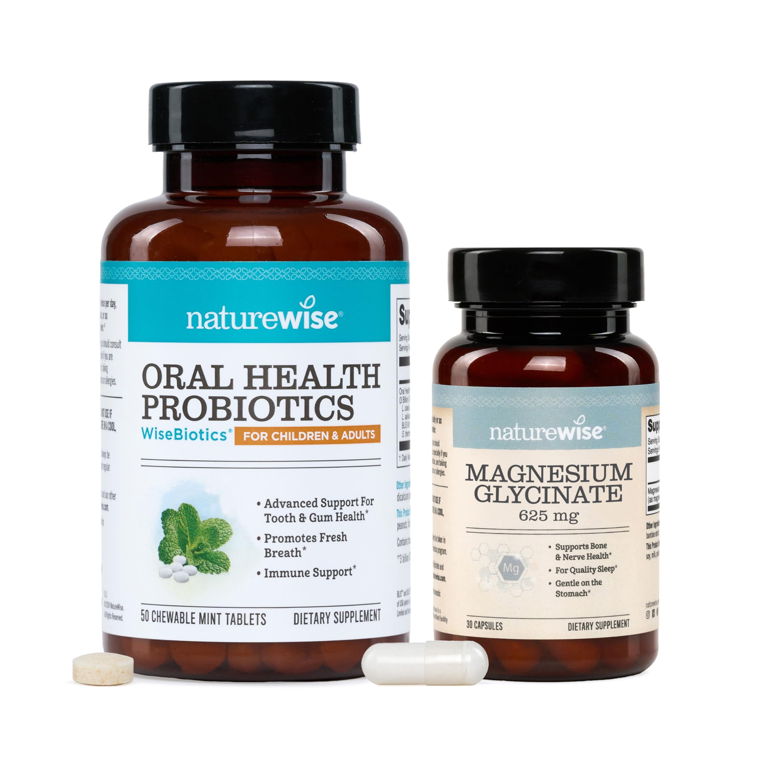 These oral probiotics can help support mouth and throat health and wellness, all in one fresh-tasting chewable tablet. NatureWise Oral Probiotics is formulated with 12 beneficial probiotic strains to promote fresh breath and support your dental health. These chewable mint tablets contain BLIS K12 and BLIS M18, which are clinically researched strains that work to promote fresh breath and better oral hygiene and health. BLIS K12 and M18 are specific strains of the bacteria Streptococcus salivarius that naturally occur in the mouths of some individuals with excellent oral health. Unike regular mints or mouthwashes, these oral probiotics may help support your mouth's microbiome. Take 1 chewable mint tablet a day to support your breath, teeth, and gum health. NatureWise Magnesium Glycinate is a high-absorption magnesium supplement designed to support heart health, nerve function, bone strength, and relaxation. Magnesium helps activate enzymes responsible for neuromuscular contractions and overall muscle performance. By promoting proper muscle relaxation and contraction, it supports a healthy heart and balanced cardiovascular function. Magnesium glycinate is a highly bioavailable form of magnesium that may help support a healthy sleep cycle and promote a sense of calm By assisting in relaxation and muscle, magnesium may contribute to overall well-being and stress management. Statements regarding dietary supplements have not been evaluated by the FDA and are not intended to diagnose, treat, cure, or prevent any disease or health condition.CLEAN, NON-GMO: These NatureWise supplements have no artificial colors, flavors, or GMOs, and are sugar-free. They do not contain wheat, gluten, soy, eggs, tree nuts, peanuts, fish, or shellfish. GENTLE ON STOMACH: Magnesium Glycinate is a bioavailable form of magnesium that is gentle on the stomach, making it the best form to support your overall health with the least side effects. . SUGAR FREE, NATURAL MINT FLAVOR: These oral health probiotics use natural mint flavor for a fresh taste, derived from non-GMO peppermint plants, without any added sugar. SLEEP AND RELAXATION SUPPORT: Magnesium glycinate may help to support a healthy sleep cycle and help the body relax by increg total dietary magnesium intake daily. . UPPER RESPIRATORY SYSTEM SUPPORT: BLIS K12 was also clinically studied in supporting upper respiratory health through colonisation of 'good bacteria,' competitive exclusion and immune support. . FULLY CHELATED FOR HIGH ABSORPTION: Chelated magnesium glycinate uses magnesium bound to the amino acid glycine, which acts as a "carrier" to enhance absorption and reduce potential digestive issues. . CLINICALLY STUDIED BLIS M18 FOR GUM HEALTH: This oral health probiotic contains BLIS M18, a probiotic strain that is clinically studied to improve gingival health and oral hygiene levels. . HIGH POTENCY MAGNESIUM GLYCINATE IN 1 CAPSULE: This formula contains 625 mg of magnesium glycinate, which is equal to 125 mg of elemental magnesium for supporting muscles, mood, sleep, and bone health. . CLINICALLY STUDIED BLIS K12 FOR FRESH BREATH: This oral probiotic has 12 strains of beneficial probiotics, including BLISK12, that is clinically studied to improve fresh breath by creating an unfavorable environment for bad breath-causing bacteria. .