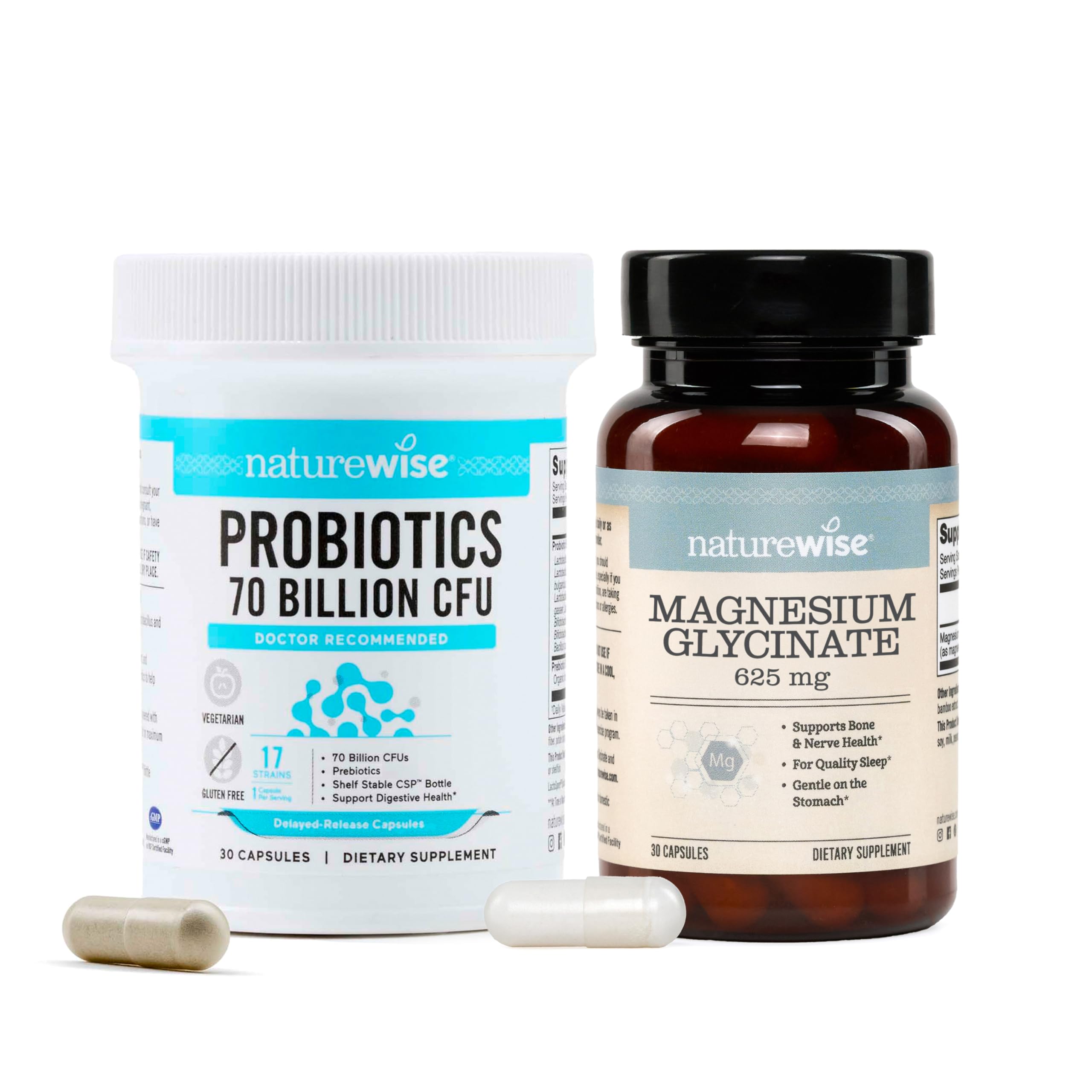 NatureWise 70 Billion CFU Probiotics is one of the highest-strength probiotics on the market, with 70 billion colony-forming units (CFUs) of gut-healthy bacteria to support your daily digestion, gut health and immune health. NatureWise 70 Billion CFU Probiotics use delayed-release capsules, which are powerful enough to survive harsh stomach acids. Support your digestive health, gut health, and immune health with this advanced probiotic formula made with beneficial probiotic strains. NatureWise 70 Billion CFU Probiotics are vegetarian, and do not contain GMOs, gluten, wheat, or soy. These probiotic supplements are proudly manufactured in USA-based facilities that comply with the strictest cGMP standards and are carefully tested by third-party laboratories for purity and potency. NatureWise Magnesium Glycinate is a high-absorption magnesium supplement designed to support heart health, nerve function, bone strength, and relaxation. Magnesium helps activate enzymes responsible for neuromuscular contractions and overall muscle performance. By promoting proper muscle relaxation and contraction, it supports a healthy heart and balanced cardiovascular function. Magnesium glycinate is a highly bioavailable form of magnesium that may help support a healthy sleep cycle and promote a sense of calm By assisting in relaxation and muscle, magnesium may contribute to overall well-being and stress management. Statements regarding dietary supplements have not been evaluated by the FDA and are not intended to diagnose, treat, cure, or prevent any disease or health condition.CLEAN, NON-GMO: These NatureWise supplements have no artificial colors or flavors. It is non-GMO and vegan. It does not contain wheat, gluten, eggs, dairy, soy, peanuts, tree nuts, fish, shellfish, or sesame. 3rd PARTY TESTED, QUALITY ASSURED: These NatureWise supplements are 3rd party tested for purity and efficacy and manufactured in the USA with high-quality ingredients from around the world in a cGMP-certified facility. GENTLE ON STOMACH: Magnesium Glycinate is a bioavailable form of magnesium that is gentle on the stomach, making it the best form to support your overall health with the least side effects. . VEGETARIAN, NON-GMO: This probiotic is vegetarian, gluten-free, non-GMO, and does not contain wheat, eggs, soy, tree nuts, peanuts, fish, or shellfish. SLEEP AND RELAXATION SUPPORT: Magnesium glycinate may help to support a healthy sleep cycle and help the body relax by increg total dietary magnesium intake daily. . MADE TO SURVIVE: Not only do we deliver these probiotics in CSP bottles that are shelf-stable (no refrigeration needed), but we also use delayed-release capsules, so that your probiotics survive harsh stomach acids and get right to where they're most needed in the gut. FULLY CHELATED FOR HIGH ABSORPTION: Chelated magnesium glycinate uses magnesium bound to the amino acid glycine, which acts as a "carrier" to enhance absorption and reduce potential digestive issues. . ORGANIC PREBIOTICS: Prebiotics act as fuel for gut-healthy bacteria, so we included organic prebiotics to offer a 2-in-1, comprehensive probiotic supplement. HIGH POTENCY MAGNESIUM GLYCINATE IN 1 CAPSULE: This formula contains 625 mg of magnesium glycinate, which is equal to 125 mg of elemental magnesium for supporting muscles, mood, sleep, and bone health. . POWERFUL GUT SUPPORT: Our high-potency probiotic offers 70 billion colony-forming units (CFUs) of 17 unique strains to support your daily digestion, gut health and immune health. .