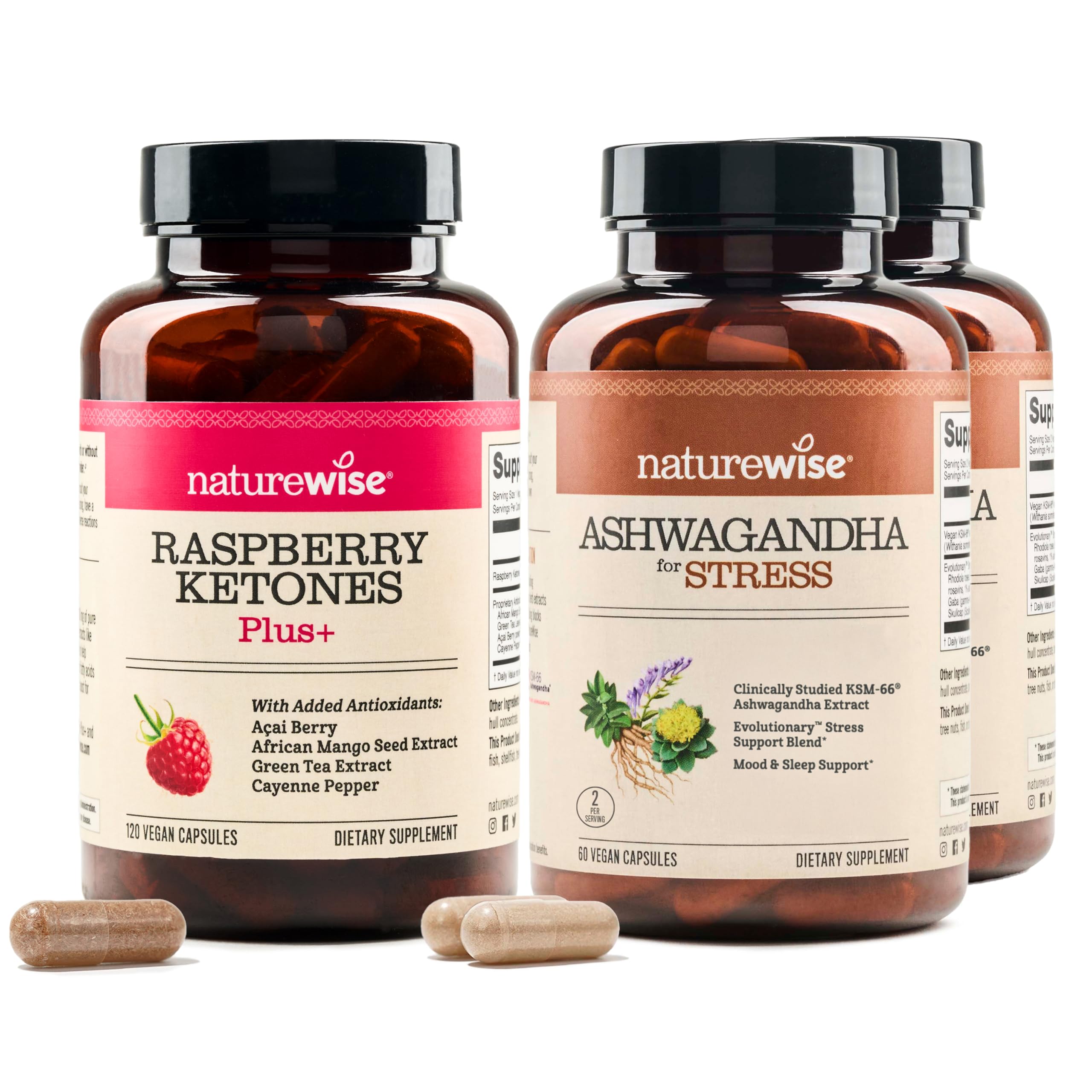 Raspberry ketones have garnered attention for their potential health benefits, offering a natural and promising addition to a balanced lifestyle. These compounds, derived from red raspberries, are renowned for their ability to support weight management efforts. Furthermore, they have been associated with improved energy levels, providing a natural lift without the jitters or crashes often associated with stimulants. Moreover, raspberry ketones may have potential benefits for cardiovascular health by positively impacting lipid profiles and blood pressure levels. When incorporated into a comprehensive wellness regimen, raspberry ketones offer a holistic approach to achieving and maintaining a healthier, more vibrant lifestyle. NatureWise Ashwagandha for Stress is a premium blend of studied herbs and nutrients designed to promote a healthy stress response and better sleep quality. Ashwagandha is an adaptogenic herb that has been shown in studies to support overall sleep quality, stress response, and mood. This supplement also features the Evolutionary Stress Support Blend which contains Rhodiola, L-Theanine, GABA, and Chinese Skullcap. Support yourself in times of stress with this blend of quality herbal ingredients curated for complete stress support. NatureWise Ashwagandha for Stress is vegan, gluten-free, and does not contain wheat, gluten, eggs, soy, dairy, tree nuts, peanuts, fish, or shellfish. Statements regarding dietary supplements have not been evaluated by the FDA and are not intended to diagnose, treat, cure, or prevent any disease or health condition.PREMIUM INGREDIENTS: These NatureWise supplements are manufactured in the USA with high-quality ingredients from around the world in a cGMP-certified facility with third-party quality control audits. Support Satiety: Raspberry ketones might support hunger management and healthy craving habits by influencing hormones related to hunger and fullness, these compounds may help you feel more satisfied after meals, potentially leading to less caloric intake. L-THEANINE GABA: This stress-support formula contains L-Theanine and GABA, which are both supportive of sleep quality. . Boosts Energy Levels: Some users report an increase in energy levels when taking raspberry ketones. This could be attributed to the improved breakdown of fats, which releases energy stored in fat cells. Higher energy levels can positively impact your daily activities and exercise routine. RHODIOLA CHINESE SKULLCAP: Our Ashwagandha for Stress is formulated with rhodiola which is another adaptogenic herb, and Chinese Skullcap, which is rich in antioxidants. . KSM-66 ASHWAGANDHA: Every serving contains 600 mg of clinically studied KSM-66 Ashwagandha Root Extract, a high-concentration extract of this adaptogenic herb. Supports Healthy Weight Management: Raspberry ketones are often recognized for their role in weight management. They are believed to enhance the metabolism of fat cells by promoting the balanced and efficient breakdown of fats, potentially aiding in weight loss efforts. When combined with a balanced diet and regular exercise, raspberry ketones may contribute to a healthier body composition. .
